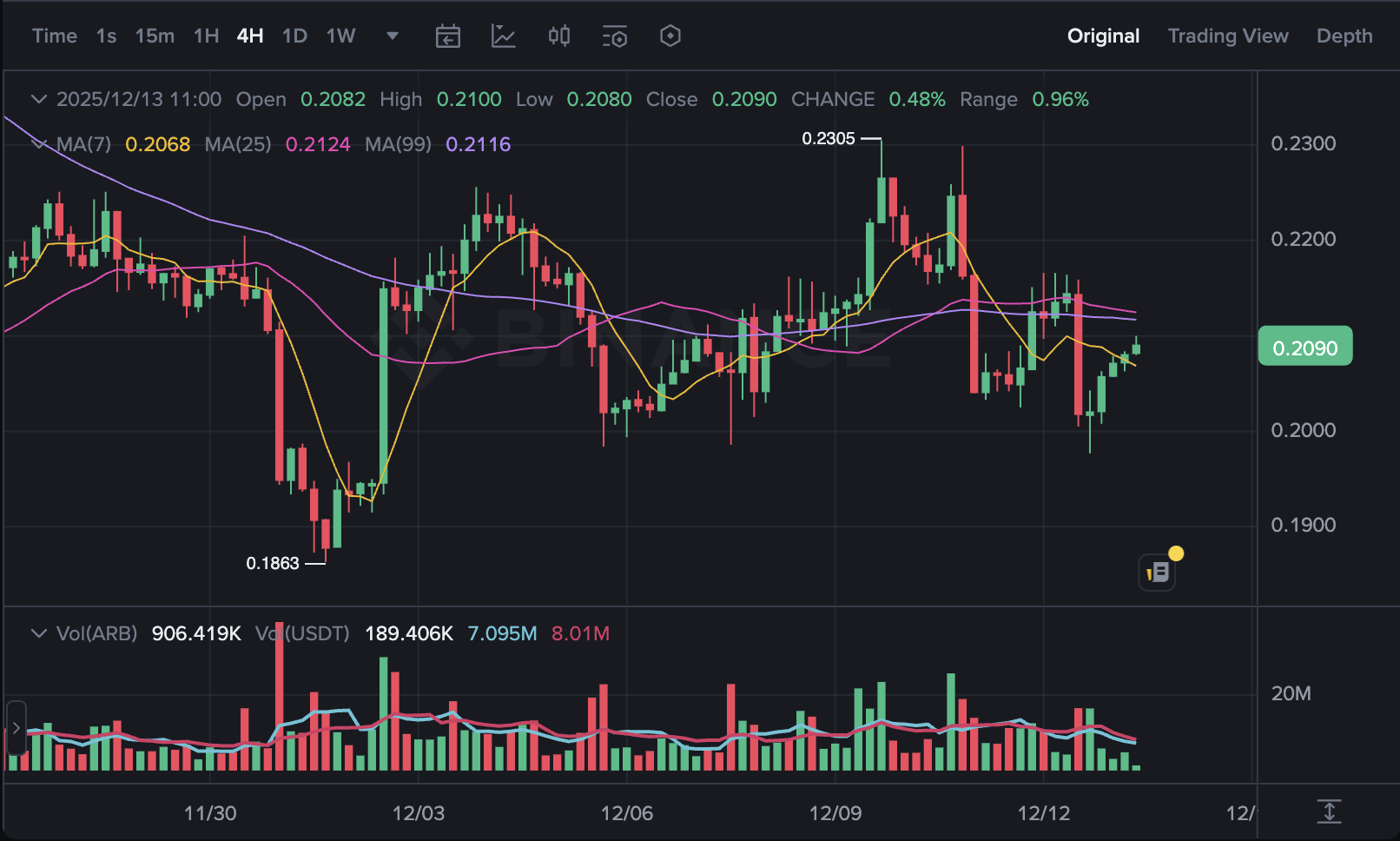 Arbitrum (ARB) mostró un gráfico indeciso en las últimas 24 horas. Al momento de la publicación del artículo, el precio de ARB rondaba los $0.208, alcanzando un máximo diario de aproximadamente $0.216 y un mínimo de alrededor de $0.198.