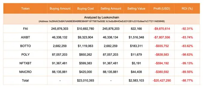 Lookonchain monitoreó las tenencias de la ballena en seis tokens de agente de IA. Los datos en cadena revelaron que FAI sufrió la mayor pérdida, con una caída del 92,31 %, hasta los 9,87 millones de dólares. AIXBT perdió 7,81 millones de dólares, un 83,74 % menos que el precio de compra.