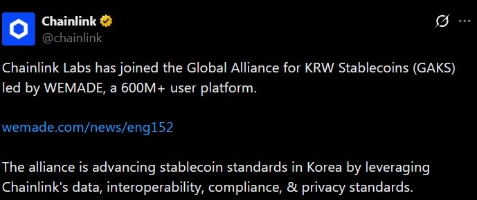La empresa de blockchain Wemade añadió Chainlink Labs a su Alianza Global para Stablecoins de KRW (GAKS), expandiendo la infraestructura de datos y oráculos del consorcio mientras construye rieles enfocados en el cumplimiento para stablecoins vinculadas al won.