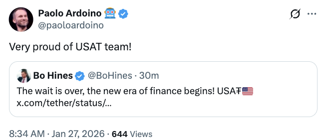 "$USDT ha demostrado durante más de una década que los dólares digitales pueden ofrecer confianza, transparencia y utilidad a escala mundial", señaló el CEO, añadiendo que USAt amplía esa misión al proporcionar un producto regulado a nivel federal y diseñado para Estados Unidos.