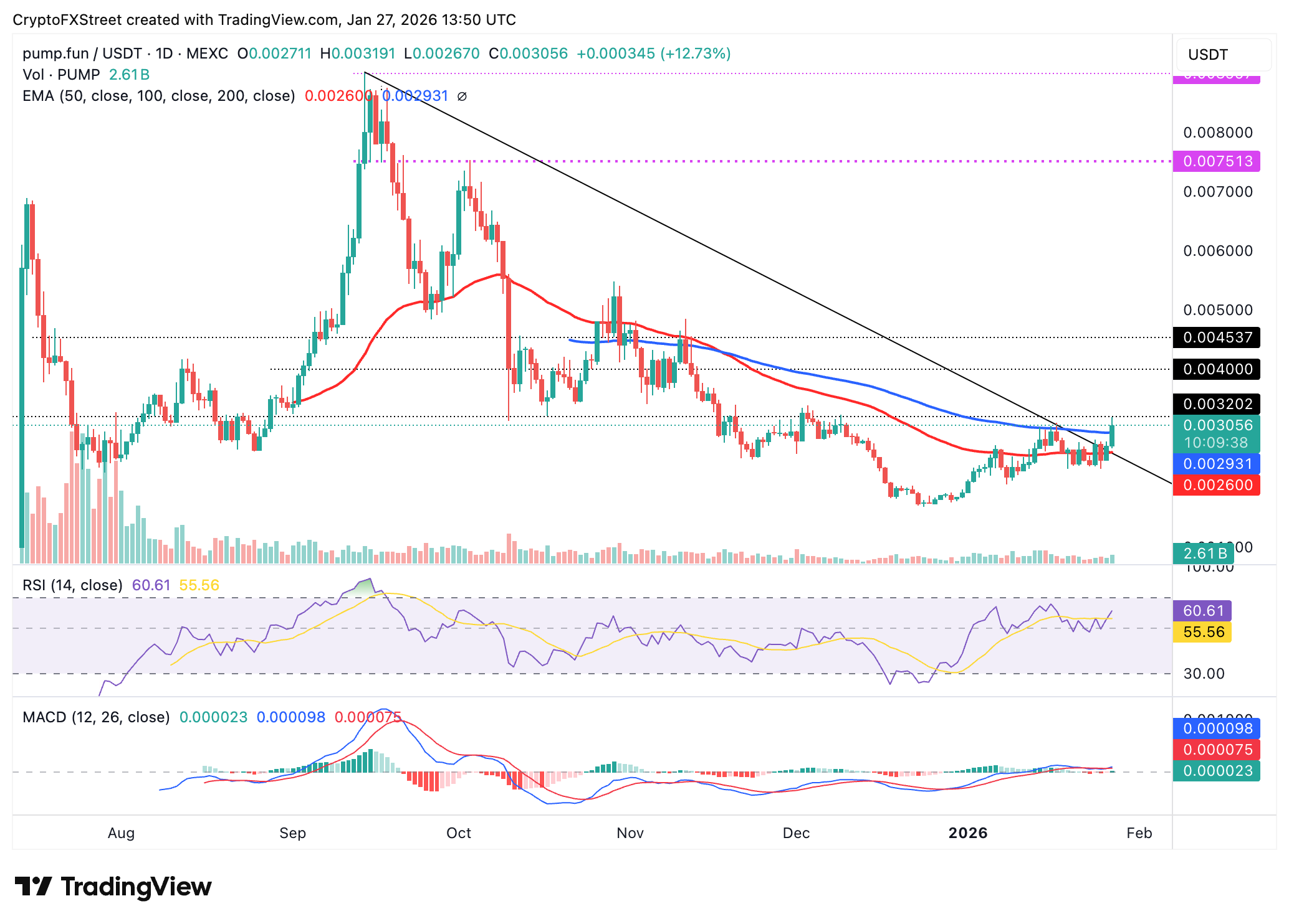 Aún así, los traders deben ser cautelosos ante posibles tomas de beneficios, incertidumbre microeconómica y tensiones geopolíticas, que podrían empujar a $PUMP por debajo de 0.00300$. La media móvil exponencial de 100 días (EMA) está lista para absorber la presión de venta en 0.00293$ y la EMA de 50 días en 0.00260$.