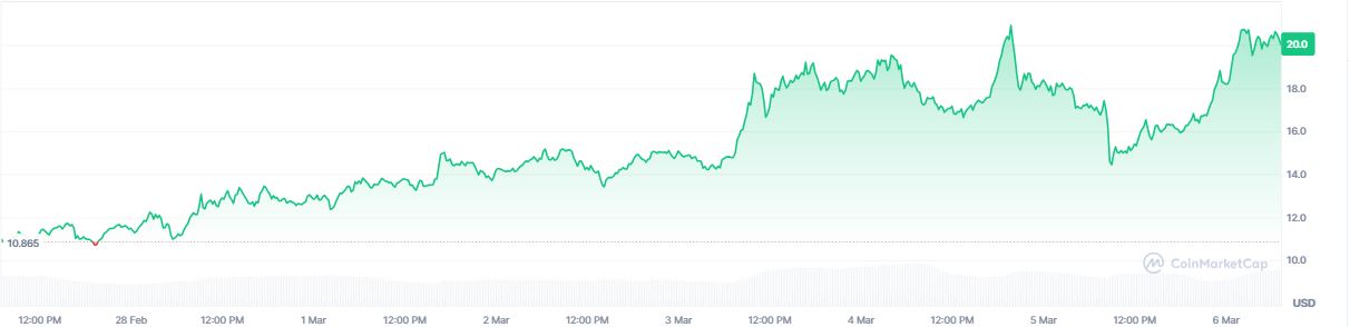 Su precio pasó de 10,99 a 20 dólares en los últimos siete días, lo que representa un incremento del 82%, tal como se observa en el siguiente gráfico: