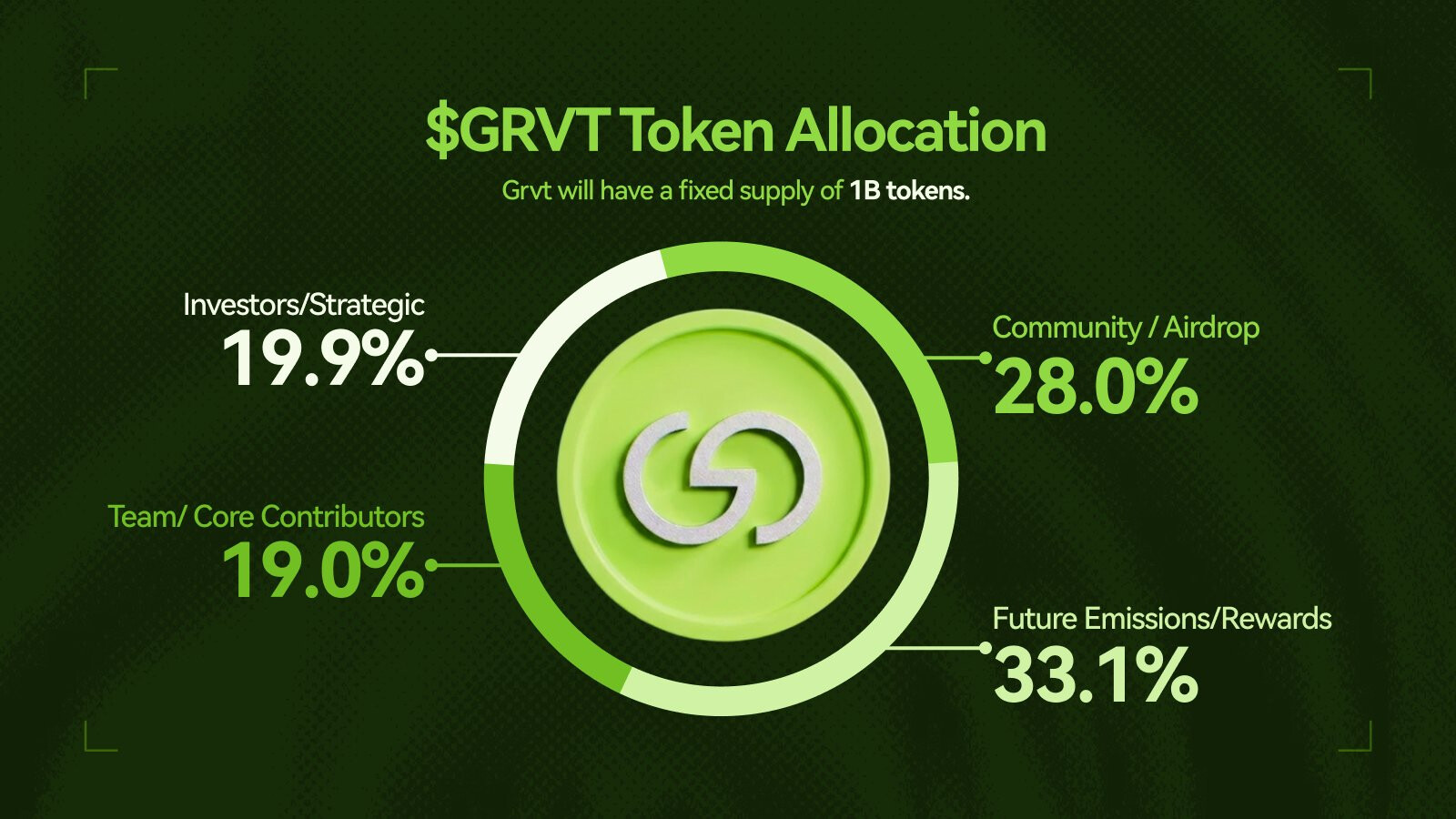 El suministro total de tokens está fijado en 1.000.000.000 tokens (1.000 millones de $GRVT), sin emisión adicional que supere ese límite. Una vez que el token esté disponible, el 28% se destinará a la comunidad y se asignará mediante airdrop. El 72% restante se distribuirá entre el equipo, los inversores y el ecosistema en general de forma programada, diseñada para priorizar la alineación a largo plazo.