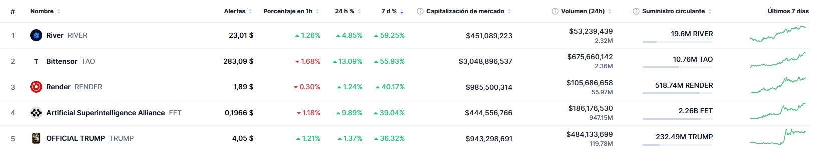 Al mismo tiempo, el rally de $TAO —criptomoneda apodada por muchos inversores como «el bitcoin de la inteligencia artificial» (aunque nada tiene que ver con bitcoin)— se montó sobre una ola sectorial más amplia. Varios tokens vinculados con la inteligencia artificial lideraron las ganancias semanales de las criptomonedas. En ese contexto se destacaron render (RENDER) y Artificial Superintelligence Alliance (FET).