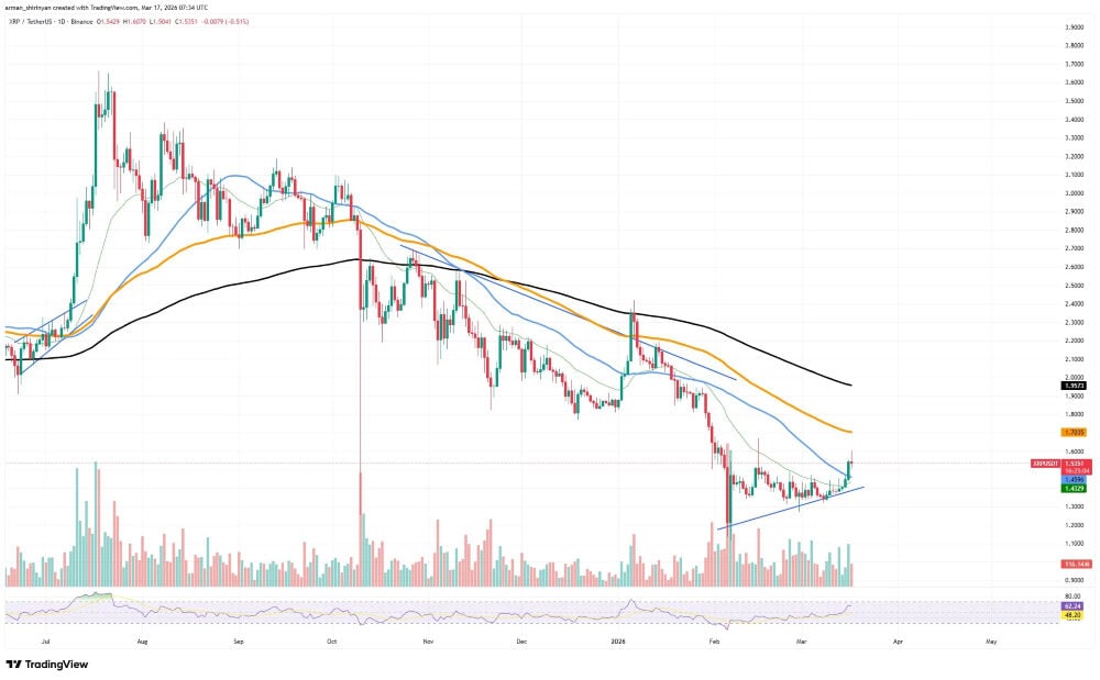Tras la caída de febrero, $XRP ha formado técnicamente una línea de soporte en ascenso gradual, lo que indica que los compradores intentan estabilizar el precio. Gracias a este movimiento alcista gradual, el activo ha podido probar los niveles de resistencia cercanos creados por las medias móviles a corto plazo, lo que le ha permitido superar el rango de soporte inmediato en torno a 1.43 dólares.