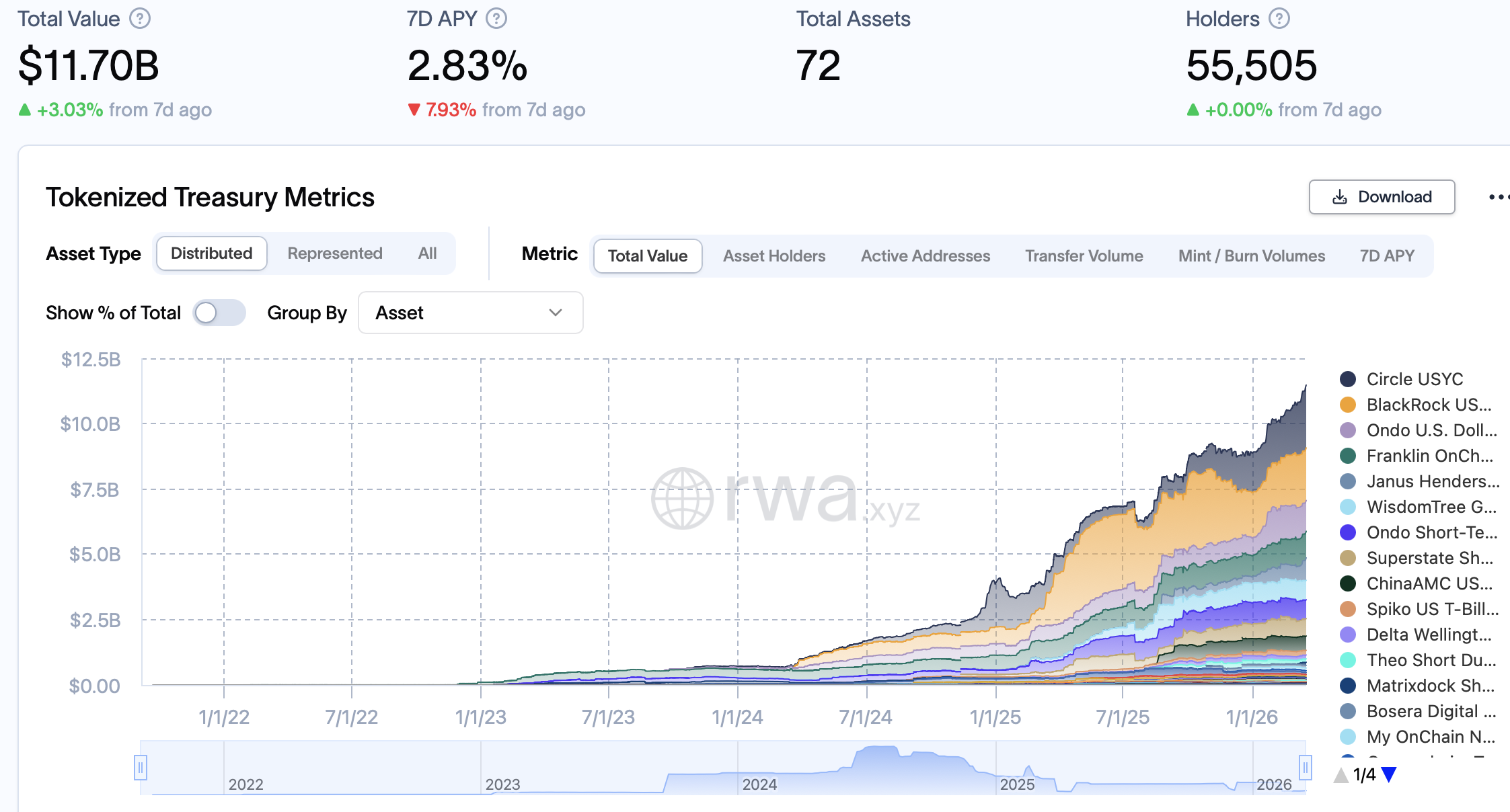 Según datos de RWA.xyz, el valor de los activos del mundo real tokenizados se ha disparado a más de 27.000 millones de dólares desde aproximadamente 5.700 millones de dólares a principios de 2025. Gran parte de ese crecimiento ha sido impulsado por los productos tokenizados del Tesoro de EE. UU., que representan más de 11.000 millones de dólares en valor onchain.