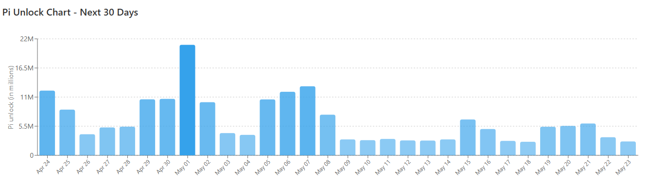 Los próximos desbloqueos podrían añadir más presión. Casi 200 millones de PI están programados para liberarse en los próximos 30 días, con el 1 de mayo como el mayor día de desbloqueo, al concentrar 20,9 millones de tokens. Los desbloqueos no garantizan ventas, pero sí aumentan la cantidad de oferta que los holders pueden mover o vender una vez terminados los periodos de bloqueo.