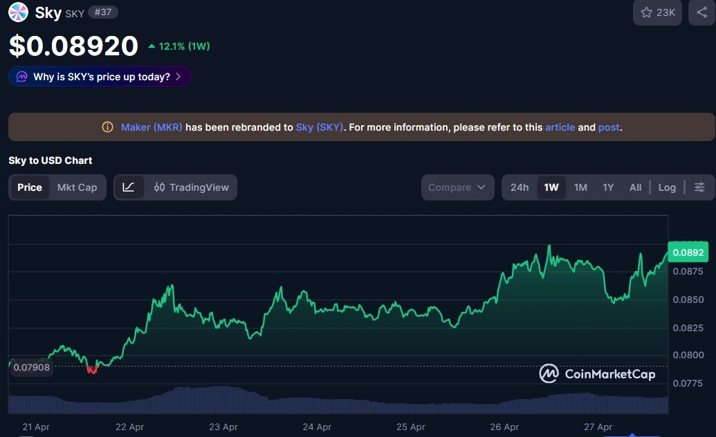 El token $SKY se cotiza actualmente a 0,089 dólares, lo que supone una subida de más del 12 % en la última semana, con una capitalización de mercado de aproximadamente 2.000 millones de dólares.