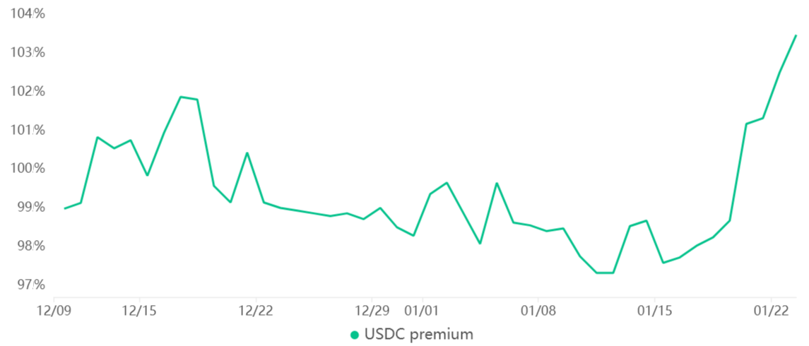 Actualmente, la prima del USDC se sitúa en el 103.5%, frente al 98.7% del 19 de enero, lo que indica una mayor demanda de stablecoins por parte de los inversores asiáticos. El movimiento coincidió con la ganancia diaria del 11% de Bitcoin el 20 de enero e indica un FOMO moderado por parte de los traders minoristas cuando el precio de BTC se acercaba a la zona de los USD 23,000.