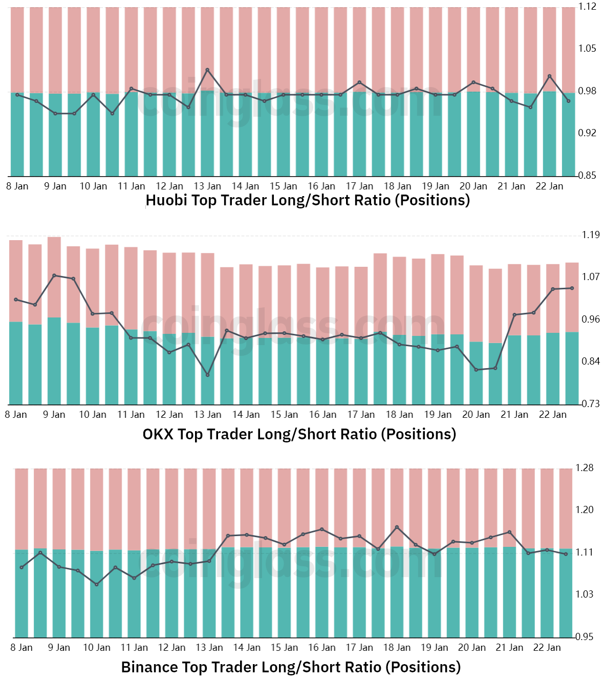 Curiosamente, los traders profesionales de OKX redujeron sus posiciones largas netas (alcistas) hasta el 20 de enero, pero cambiaron drásticamente sus posiciones durante la última fase de la carrera alcista. En un horizonte temporal de 3 semanas, la proporción de posiciones largas y cortas es de 1.05, inferior al 1.18 del 7 de enero.