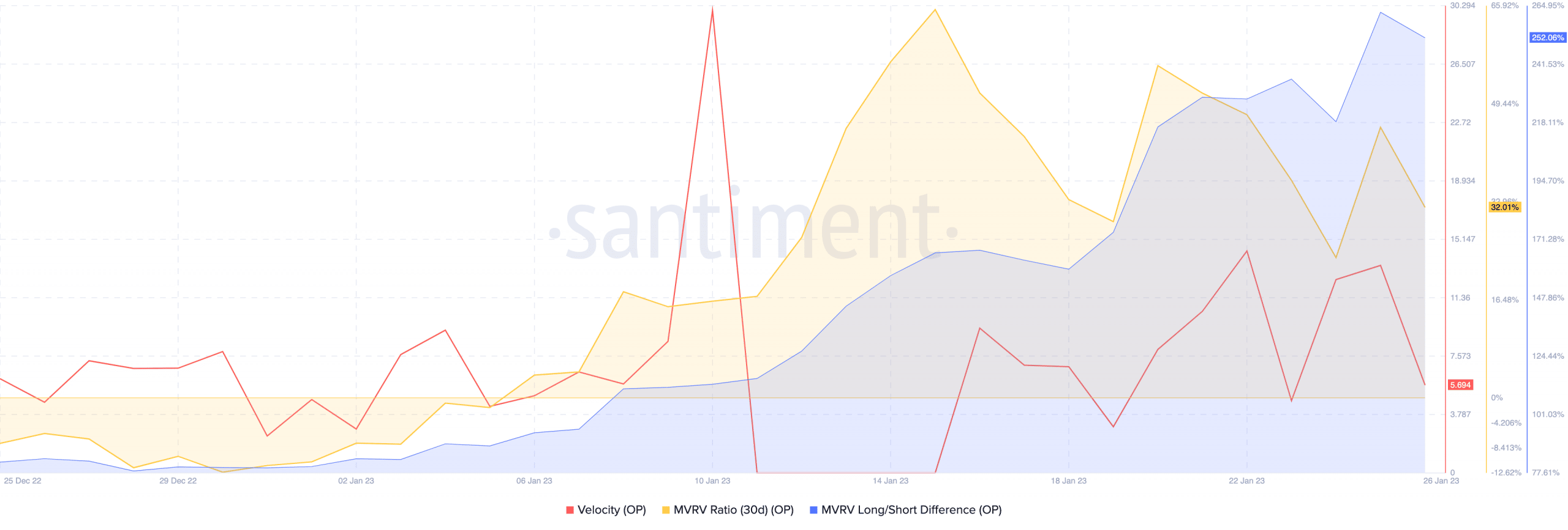 Según Santiment, la velocidad del token OP ha disminuido, junto con la relación MVRV y la diferencia larga/corta. Esto indicó que la frecuencia con la que se realizaba la OP había disminuido. La relación creciente de MVRV sugirió que la mayoría de los poseedores de tokens OP eran rentables, mientras que la creciente diferencia larga/corta implicaba que la mayoría de las direcciones que tenían el token eran poseedores a largo plazo.
