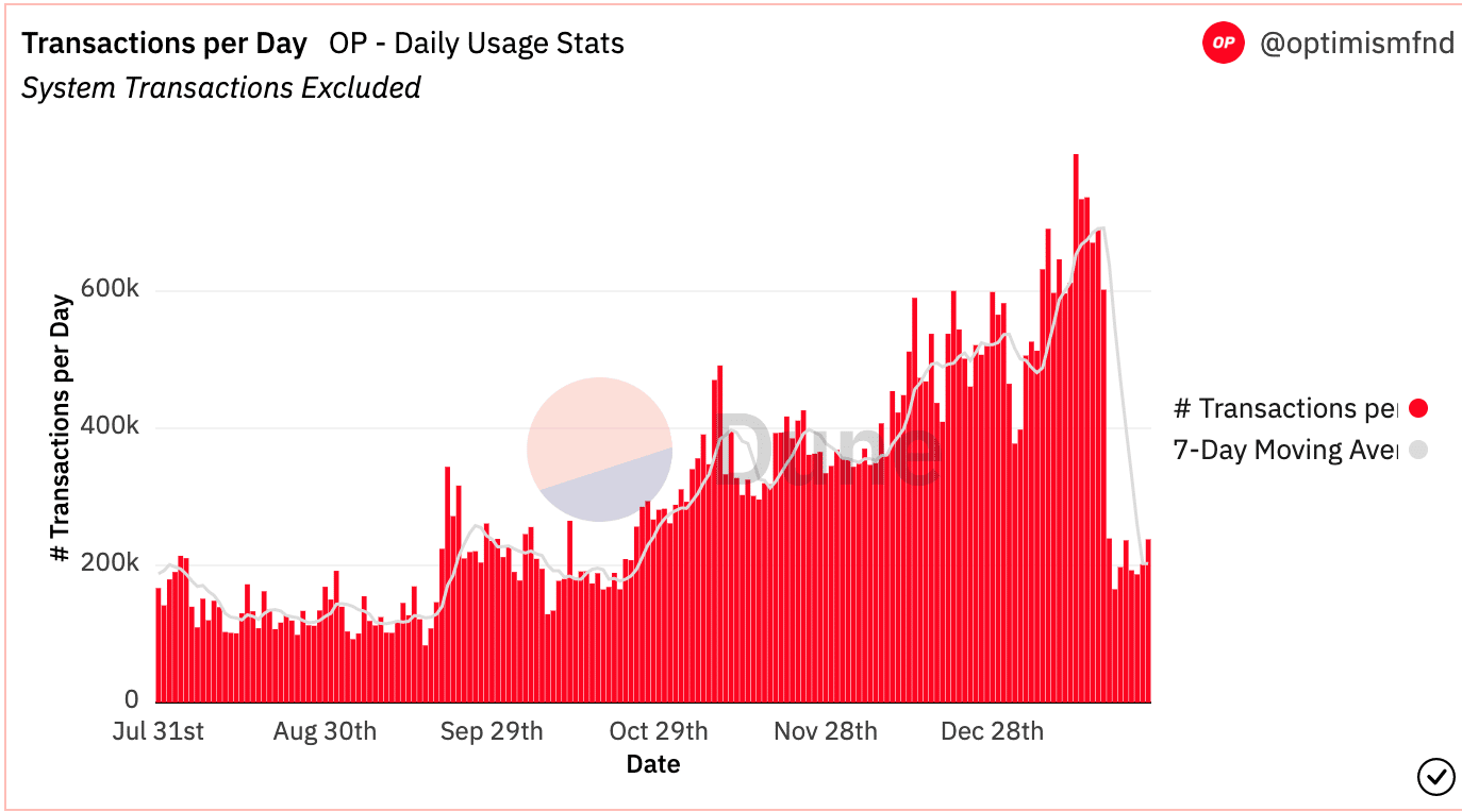 Sin embargo, vale la pena señalar que la cantidad de transacciones en Optimism ha disminuido, según Dune Analytics. Esto podría afectar potencialmente el aumento de TVL de Optimismo en el futuro. El número decreciente de transacciones puede ser una indicación de falta de liquidez o falta de interés en la red.