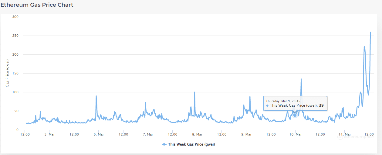 El precio de Ethereum está aumentando a medida que las tarifas del gas se dispararon después de que los vínculos del mercado de cifrado con los bancos continuaran desvaneciéndose. según datos según Etherscan, las tarifas promedio de gas superaron los 300 gwei hoy frente a las tarifas medianas anteriores de gas de 32-40 gwei.