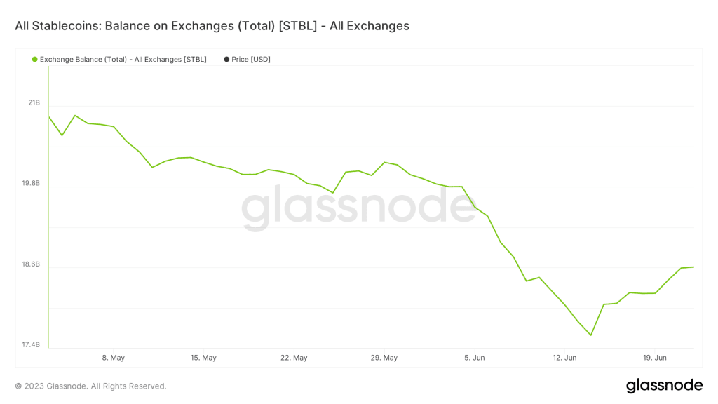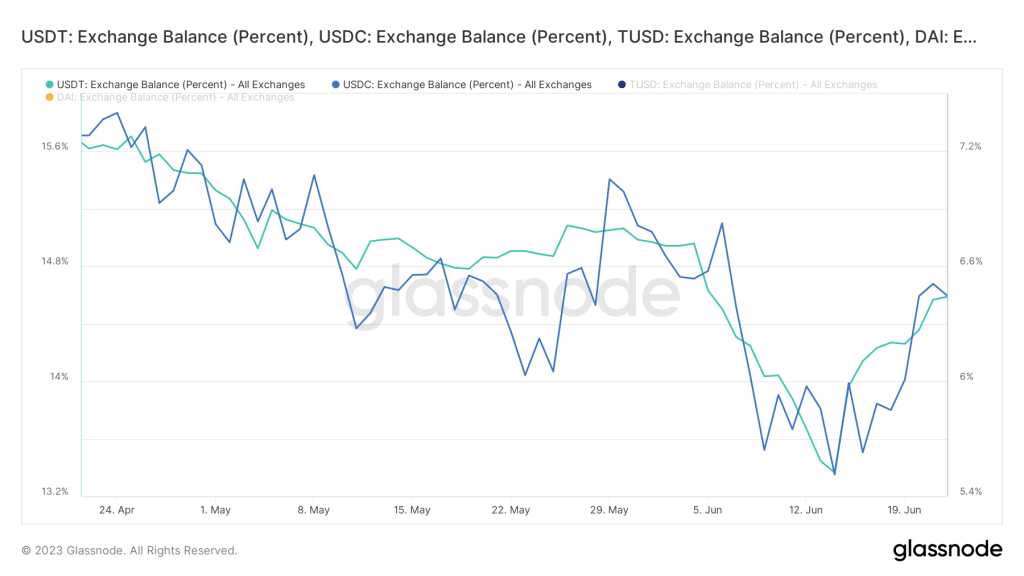 Fuente: Glassnode Tras la acción legal contra el gigante de las criptomonedas Binance por parte de los reguladores, su brazo estadounidense, Binance.US, suspendió todas las formas de comercio de dólares estadounidenses en la plataforma como parte de su transición a una plataforma «solo para criptomonedas». Como resultado, los usuarios convirtieron sus USD en monedas estables para continuar operando en la plataforma. Y aunque los retiros de USD se han vuelto a habilitar en la plataforma, Binance.US advirtió a sus usuarios que el alivio sería temporal y les pidió que convirtieran sus tenencias de USD en monedas estables. USDT, USDC lideran las entradas Según Glassnode, las monedas estables de alto rango como USDC y USDT vieron aumentar significativamente su suministro de intercambio durante la última semana. La participación de la oferta de cambio de USDT como porcentaje de la oferta circulante total aumentó del 13,6 % el 14 de junio al 14,5 % en el momento de redactar este informe. Además, la participación de USDC saltó del 5,5% al 6,4%.