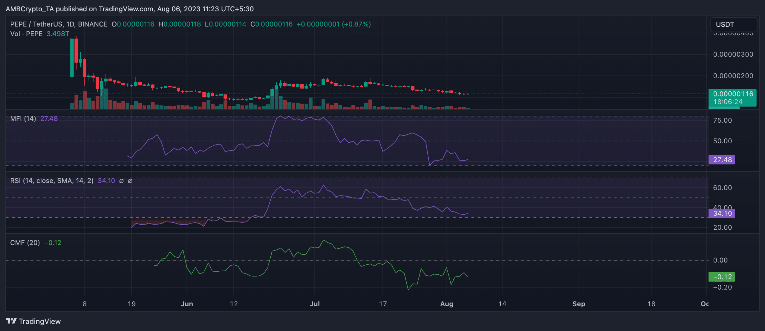 Fuente: Santiment Los indicadores clave de impulso en un gráfico diario dieron crédito a la posición anterior. En el momento de la publicación, todos descansaban debajo de sus respectivas regiones neutrales. Prácticamente sobrevendido al momento de escribir este artículo, el Índice de Fuerza Relativa del $PEPE mostró 33.06. Su índice de flujo de dinero estaba en 27,34. Asimismo, su Chaikin Money Flow registró un valor negativo de -0,13. Esto sugirió una salida de liquidez del mercado $PEPE, lo que hace que cualquier rebote de precios sea casi imposible a menos que cambie el sentimiento.