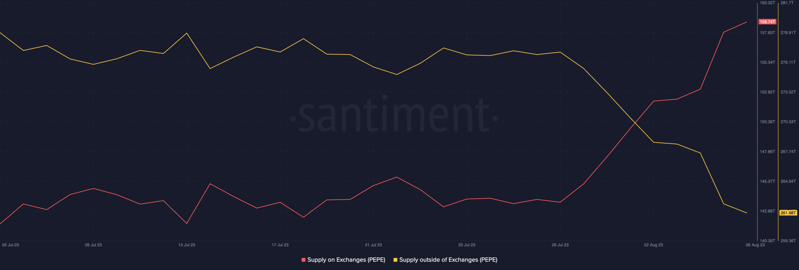 Si bien el NPL de $PEPE sugirió que el token puede haber tocado fondo, una evaluación más cercana de su desempeño en la cadena reveló que sigue habiendo una alta probabilidad de una mayor caída en el valor. En el momento de la publicación, la memecoin cambió de manos a $ 0.000001164. En la última semana, el valor de $PEPE ha disminuido un 13%, según datos de CoinMarketCap. Esto se ha debido a un aumento en las ventas masivas. Una mirada a la actividad de intercambio del token mostró un aumento constante en su suministro en los intercambios, mientras que su suministro fuera de los intercambios de cifrado disminuyó desde finales de julio. Durante ese período, la oferta de bolsas de $PEPE ha crecido un 10%. Por otro lado, su oferta fuera de las bolsas se ha reducido un 6%. Cuando las reservas de cambio de un activo aumentan de esta manera, indica una mayor actividad de distribución, ya que muchos comerciantes «se deshacen» de sus tenencias para protegerse contra las pérdidas.