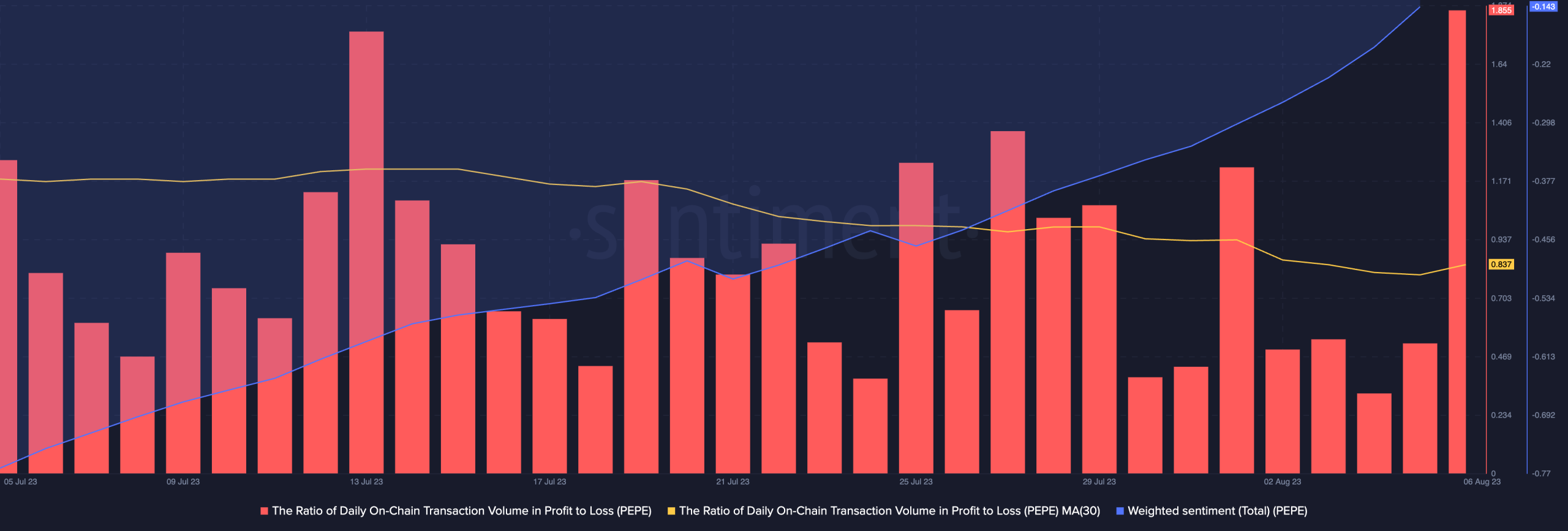 La razón del aumento de las ventas se atribuyó a la sostenida rentabilidad de las transacciones de $PEPE. En un promedio móvil de 30 días, la relación del token de transacciones diarias en cadena con ganancias ha superado a las que arrojaron pérdidas. Sin embargo, con el sentimiento ponderado por debajo de cero, la cantidad de transacciones rentables se reducirá significativamente en los próximos días.