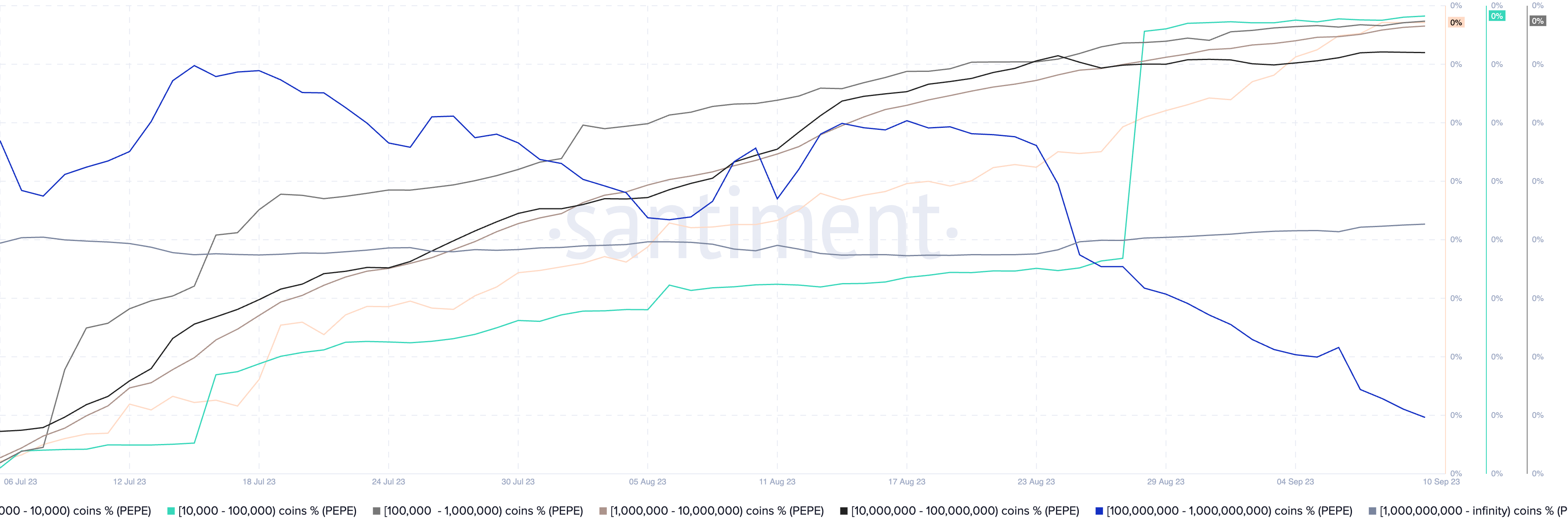 En particular, las direcciones con un saldo de entre 100 millones y 1,000 millones de $PEPE (la ola azul en el gráfico siguiente) controlan el suministro máximo en circulación del token, aproximadamente el 96.5% del mismo. El suministro en manos de este grupo se ha reducido sustancialmente desde que surgió la preocupación por el rug pull.