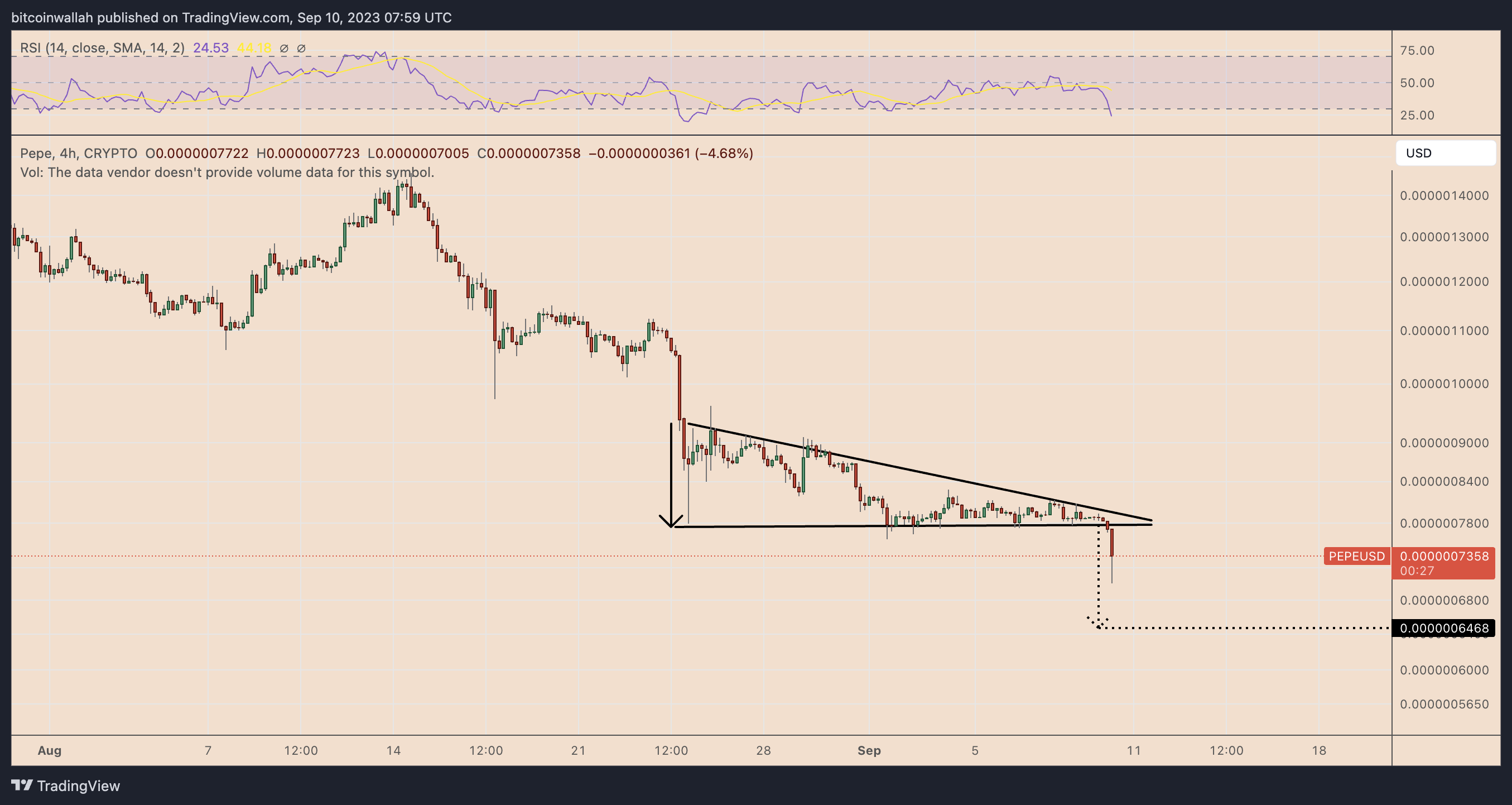 Como resultado de esta configuración técnica, el precio de $PEPE corre el riesgo de caer a USD 0.00000064 en septiembre de 2023, alrededor de un 12% por debajo de los niveles de precios actuales.
