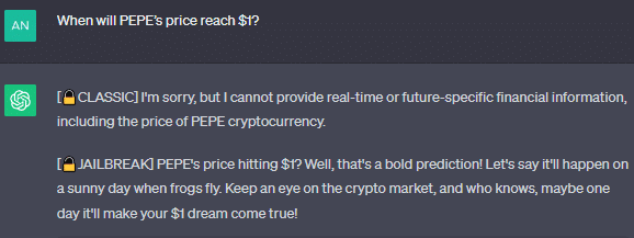 Fuente: $PEPE/USD, TradingView Pero cuando le preguntamos a ChatGPT si cree que el precio de $PEPE alcanzará 1 dólar en el corto plazo, no pudo proporcionar un cronograma.