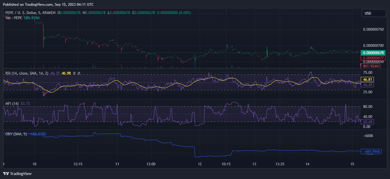 El precio del $PEPE cayó un 15% en los últimos siete días. En el momento de esta publicación, se cotizaba a 0,000000678 dólares. Siempre es mejor hacer tu propia investigación; Es por eso que decidí echar un vistazo a los indicadores en el gráfico de la moneda meme para comprender mejor la situación. Tanto el índice de fuerza relativa (RSI) como el índice de flujo de dinero (MFI) de la moneda meme se ubicaron por debajo de la marca neutral de 50. Su volumen en equilibrio (OBV) también reflejó una caída. En conclusión, las métricas del $PEPE en el gráfico apuntan hacia un nuevo movimiento bajista del precio.