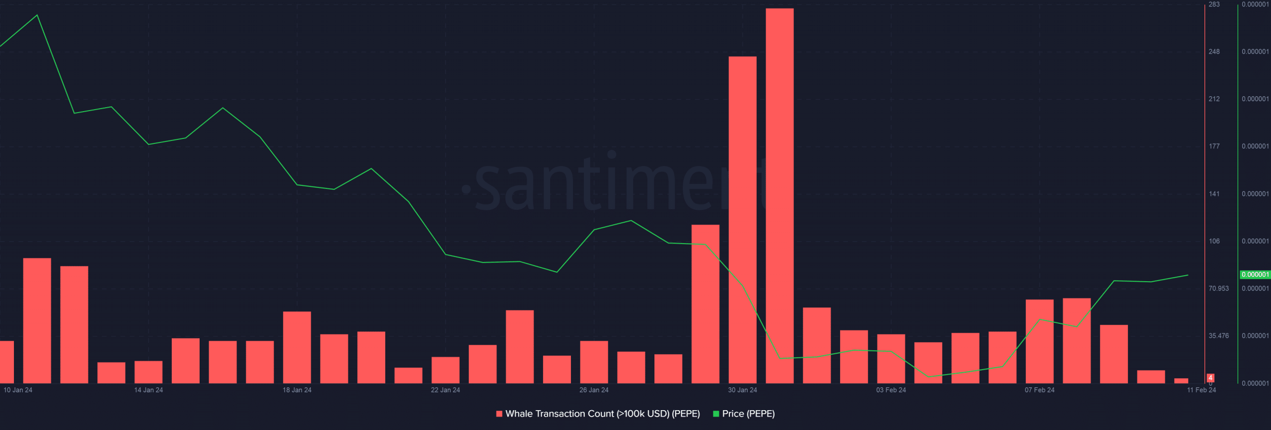 Mientras tanto, los inversores adinerados de Pepe se entusiasmaron con el reciente repunte. Según el análisis de AMBCrypto de los datos de Santiment, las transacciones de ballenas alcanzaron un máximo semanal el 8 de febrero.