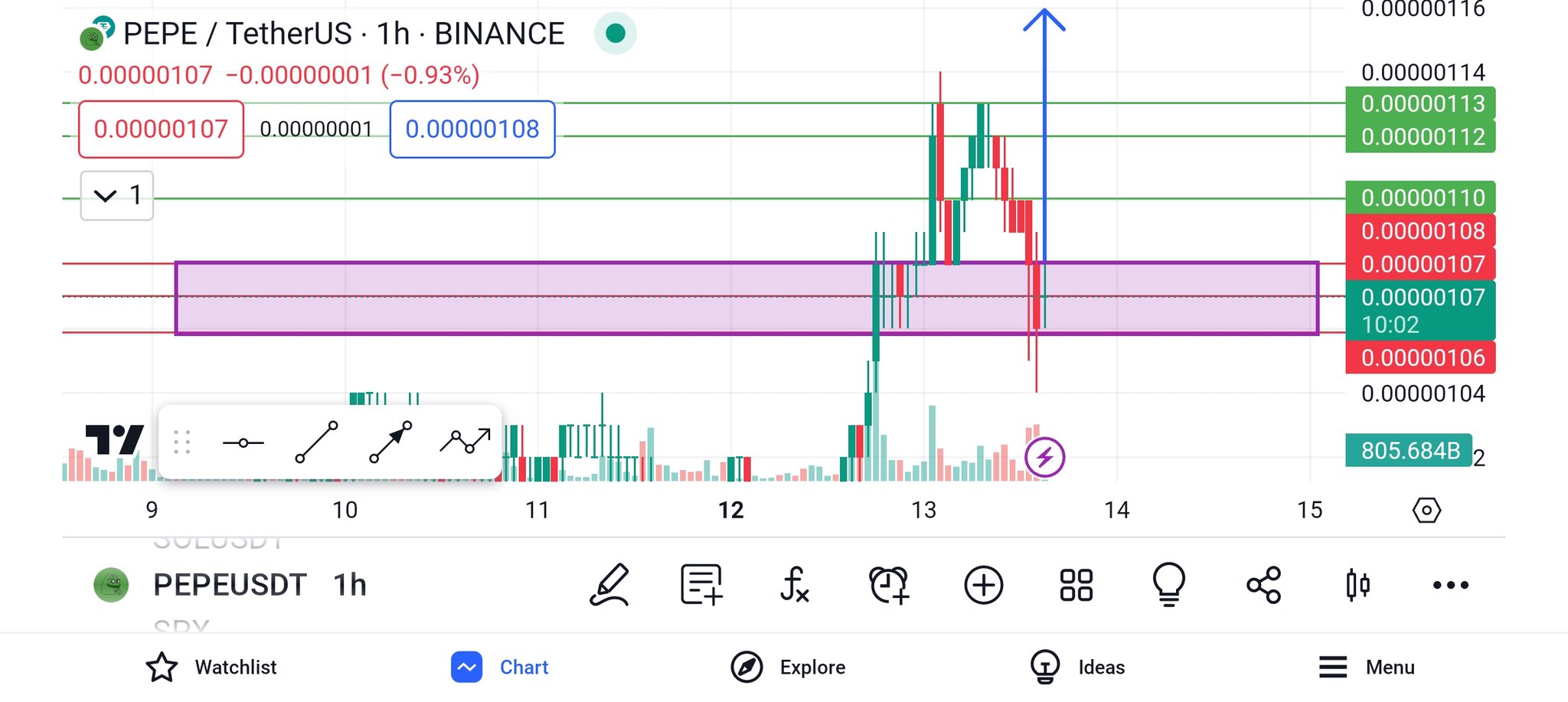 $PEPE ha aumentado desde entonces, recuperando el área horizontal de 0.00000100 dólares. El precio también rompió una línea de tendencia de resistencia descendente, alcanzando un máximo de 0.00000131 dólares el día de hoy.