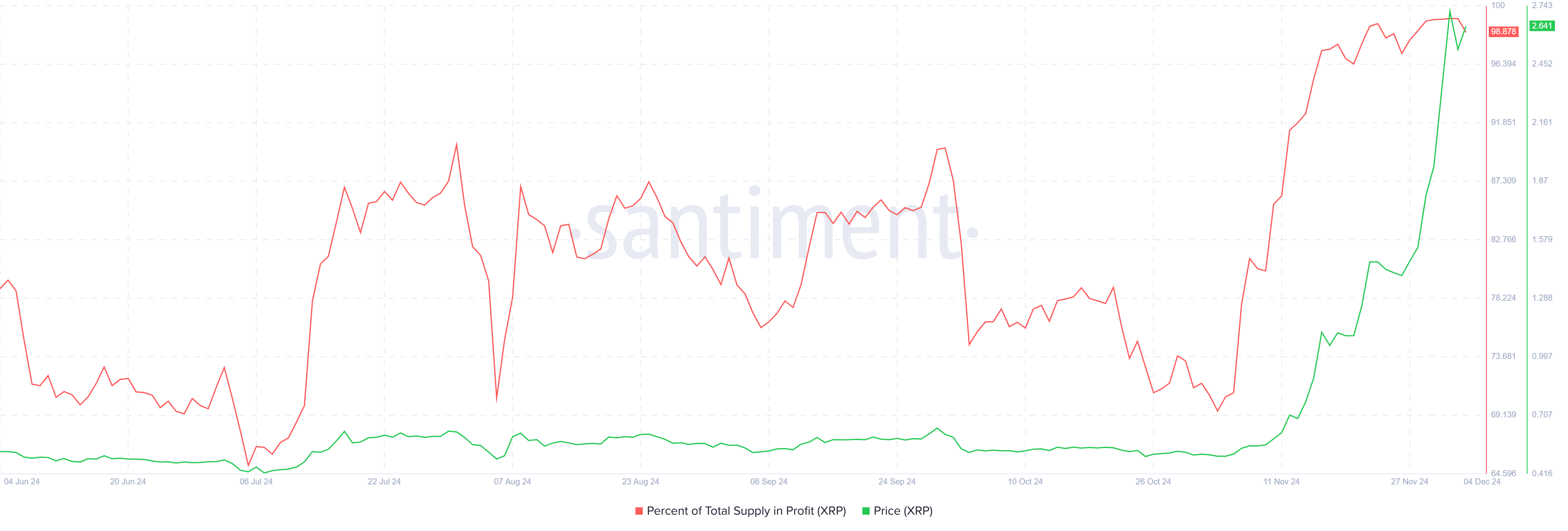 El impulso macro de XRP, aunque positivo, está comenzando a mostrar signos de saturación. El suministro total de XRP en ganancias es actualmente superior al 98%, lo que tradicionalmente sugiere que el mercado está cerca de su techo.