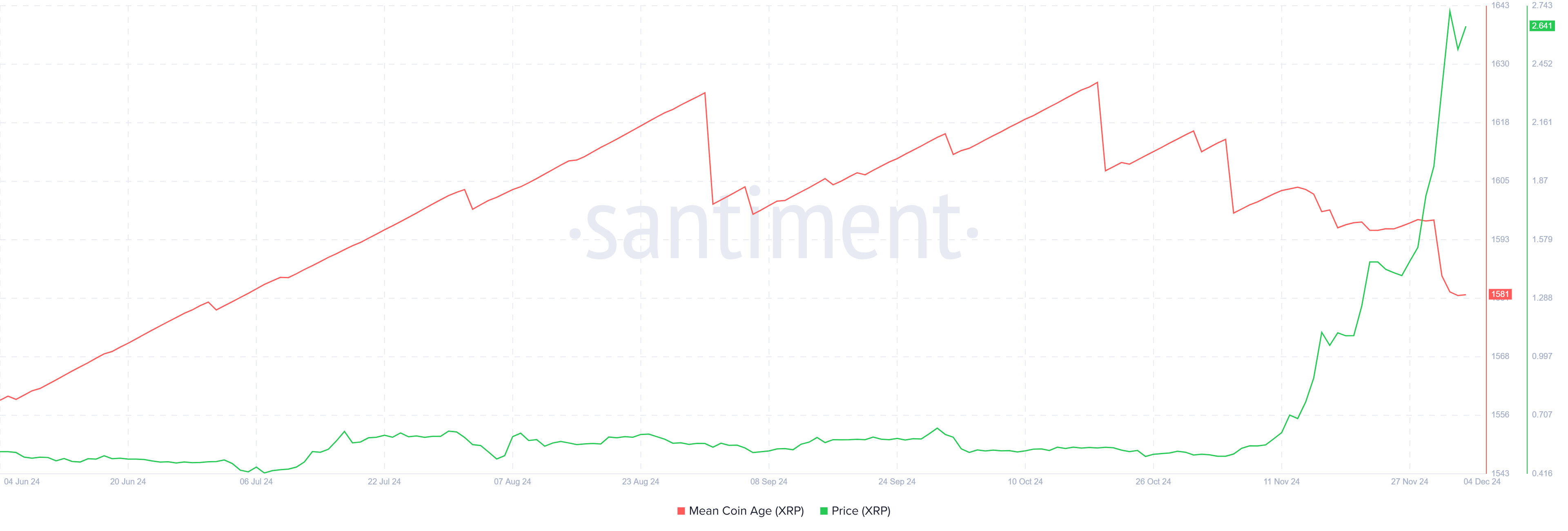 El precio de XRP ha mostrado algunos signos preocupantes, particularmente con el indicador Mean Coin Age, que ha estado disminuyendo constantemente. Cuando Mean Coin Age disminuye, generalmente sugiere que los inversores están moviendo sus holdings en lugar de mantenerlos a largo plazo.