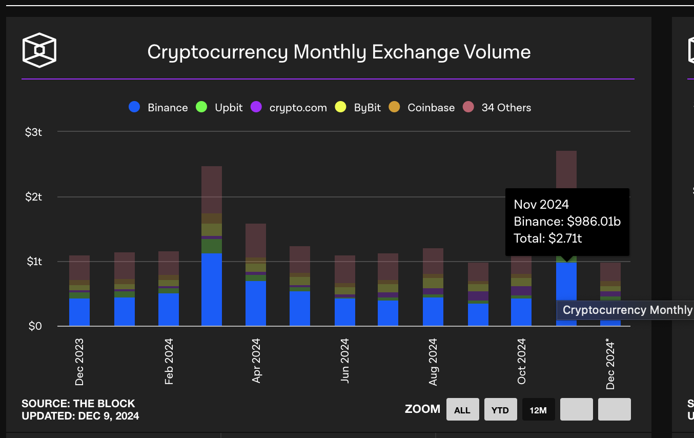 - Binance manejó el 36% del volumen de comercio del mercado global de criptomonedas en noviembre, o 986 mil millones de dólares, mientras el mercado se recuperaba tras la reelección de Trump.