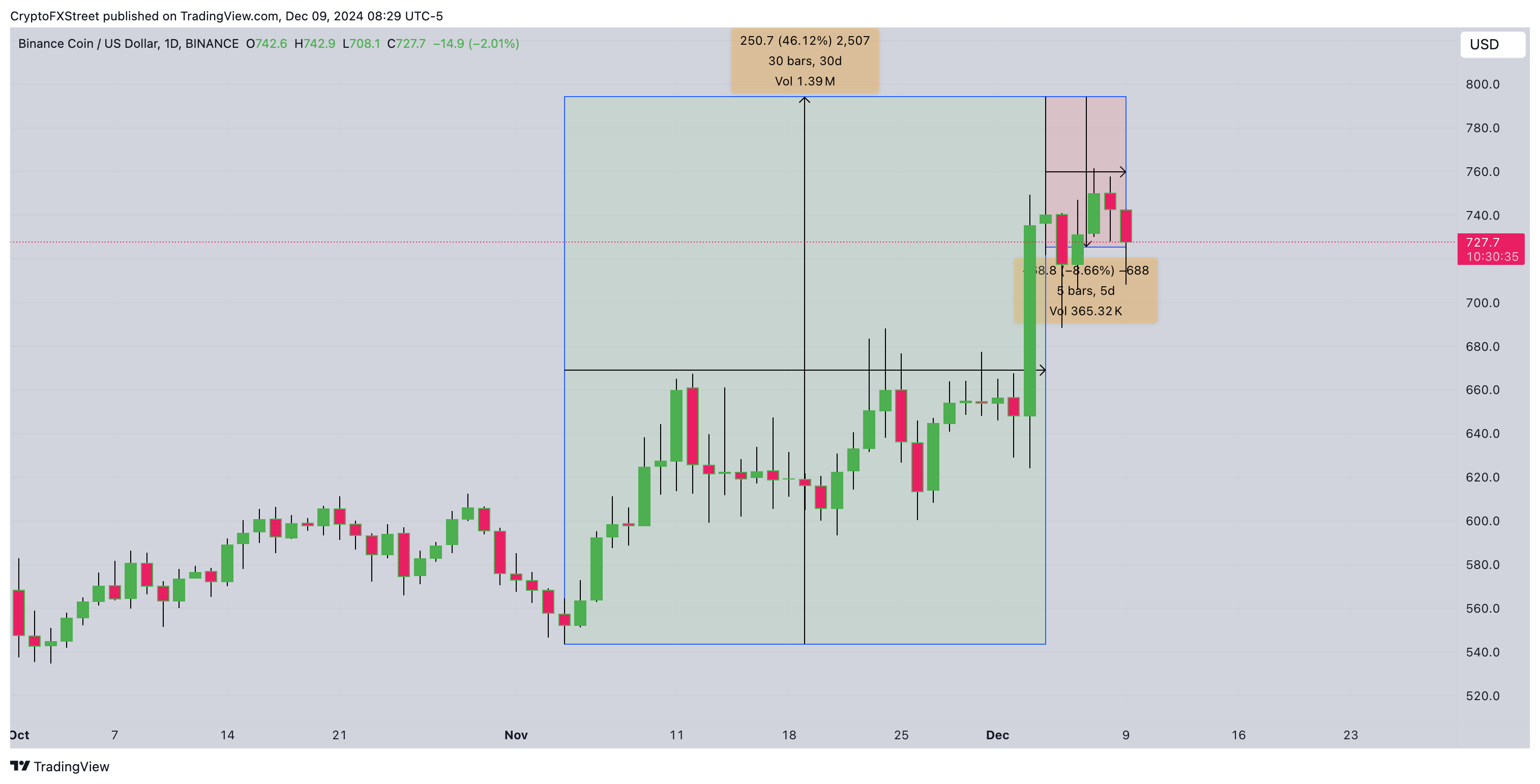 Validando esta narrativa, el gráfico anterior muestra cómo el precio de BNB subió un 46% desde 543 $ el 4 de noviembre hasta un máximo histórico de 794 $ el 4 de diciembre, antes de retroceder un 8,6% hacia el nivel de 720 $ el lunes.