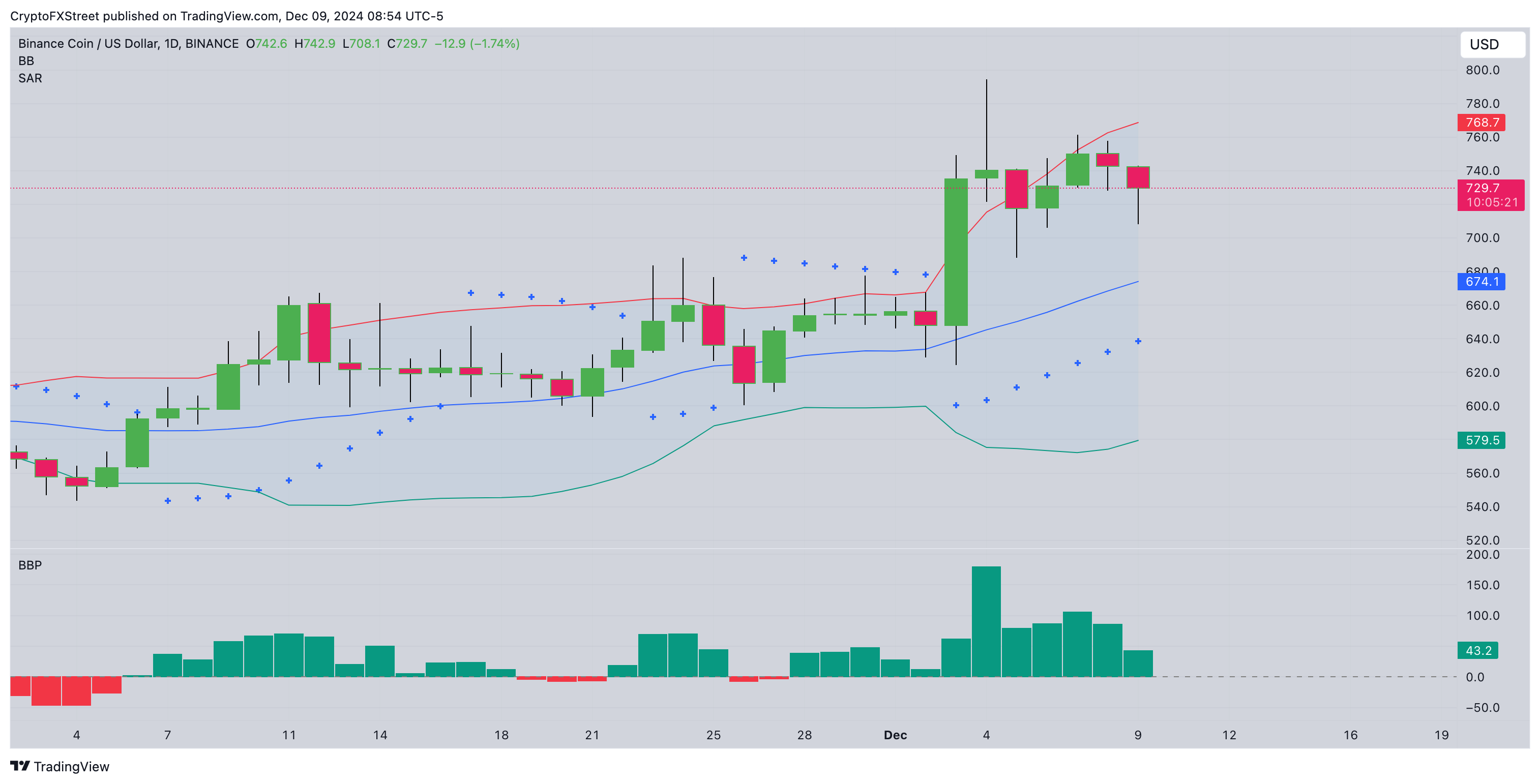 Desde una perspectiva técnica, las Bandas de Bollinger, el SAR Parabólico y el BullBear Power (BBP) también afirman el pronóstico positivo del precio de BNB, con una resistencia mayor que se avecina en 800$, mientras que el nivel de 675$ actúa como soporte crítico.