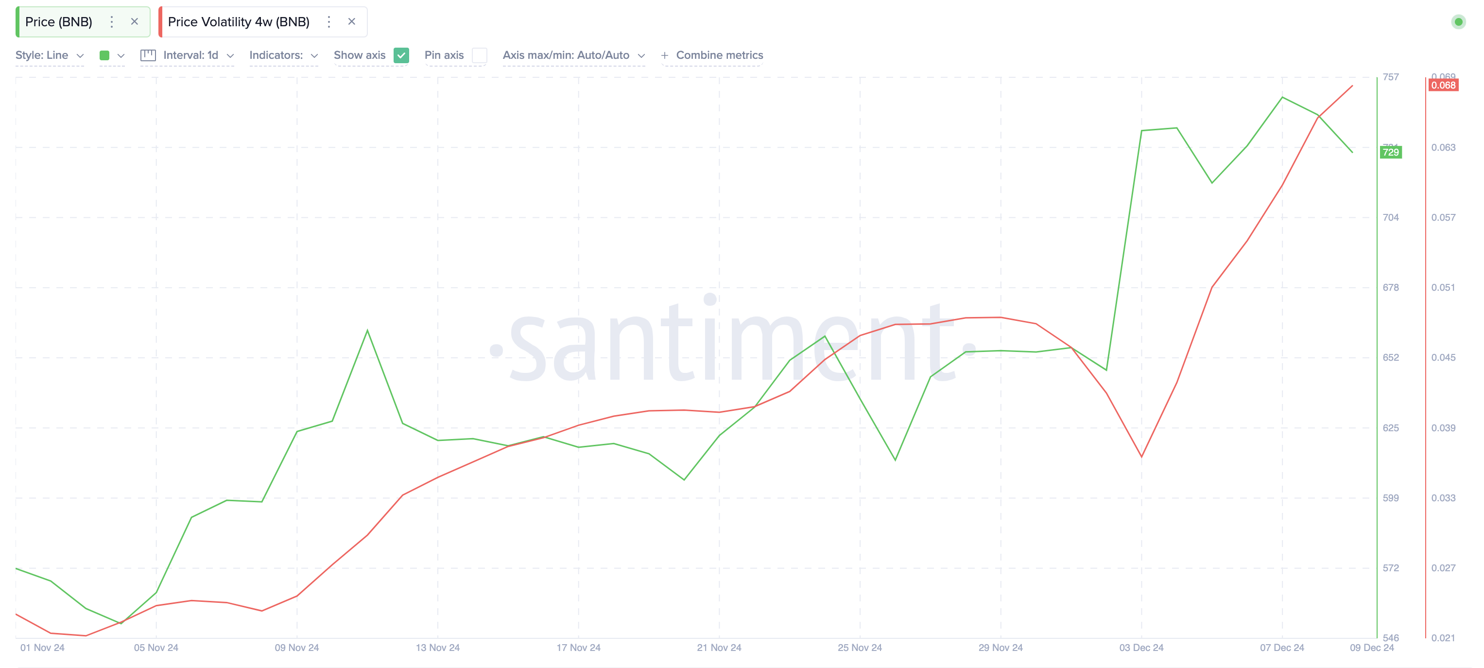 Como se ve arriba, la volatilidad de 4 semanas de BNB aumentó de 0,36 el 3 de diciembre a 0,67 el lunes, un aumento del 89%.