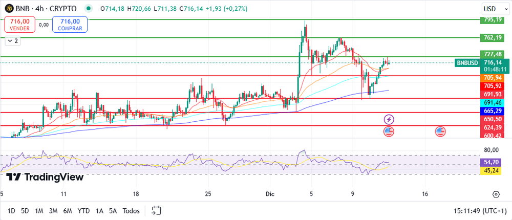 En el momento de la redacción, el precio de BNB cotiza en 715 USD, con ganancias diarias de 4,03%, pérdidas semanales de 2,27% y ganancias mensuales de 15%.