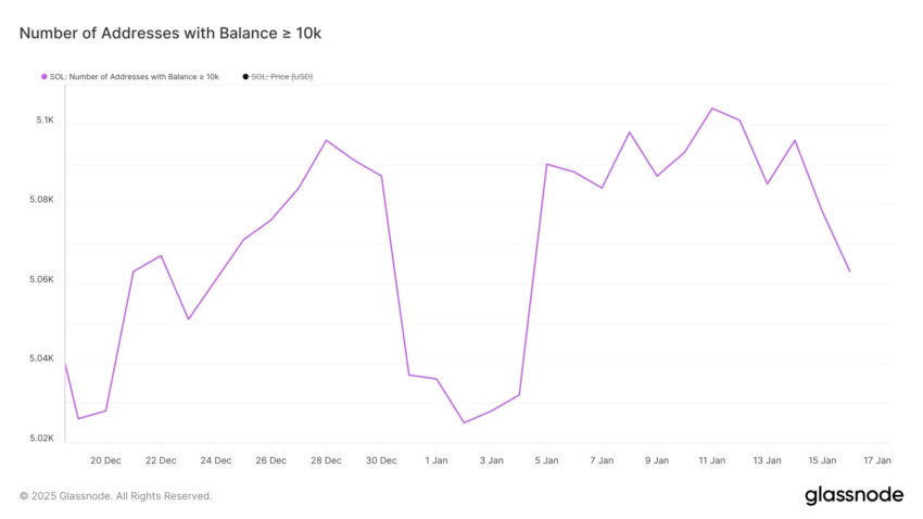 El número de direcciones que poseen al menos 10,000 SOL aumentó significativamente entre el 4 de enero y el 5 de enero, pasando de 5,032 a 5,090. Esta tendencia al alza continuó con algunas fluctuaciones, alcanzando un máximo histórico de 5,104 el 11 de enero. Rastrear a estos grandes holders, a menudo referidos como ballenas, es crucial porque su actividad puede influir fuertemente en el mercado.