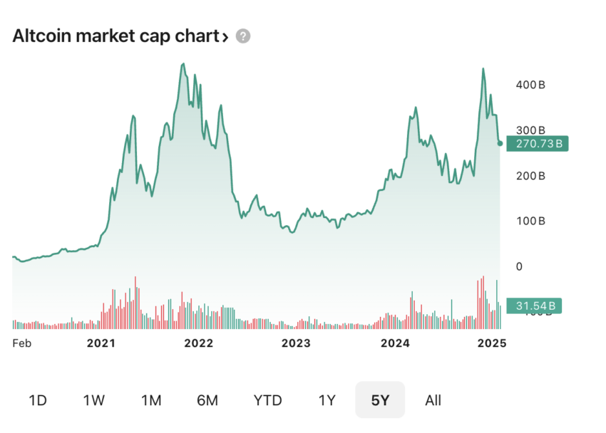 Datos de Tradingview muestran que la capitalización de mercado de las altcoins es de 270,324 mil millones de dólares, lejos de su $ATH alcanzado en octubre de 2021, cuando llegó a los 431 mil millones de dólares. El caso más dramático es Ethereum, el cual no ha recuperado su $ATH de 4,527 dólares de noviembre de 2021, mientras que BTC pasó de 67,000 a más de 108,000 dólares en los últimos tres años.
