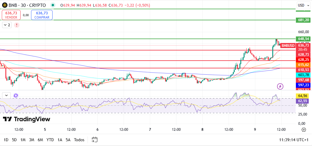 En la redacción, el precio de BNB cotiza en 638 USD con ganancias diarias de 9,82%, pérdidas semanales de 2,74% y mensuales de 8,5%. Después de varias jornadas de pérdidas, BNB presenta una gran recuperación, liderando las ganancias diarias del top 10 de criptomonedas con mayor capitalización de mercado.