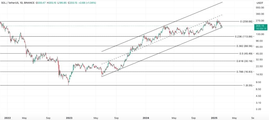 En el gráfico diario, Solana pone a prueba una zona de soporte clave formada en el límite inferior de un canal paralelo ascendente en el que se ha negociado durante varios meses.