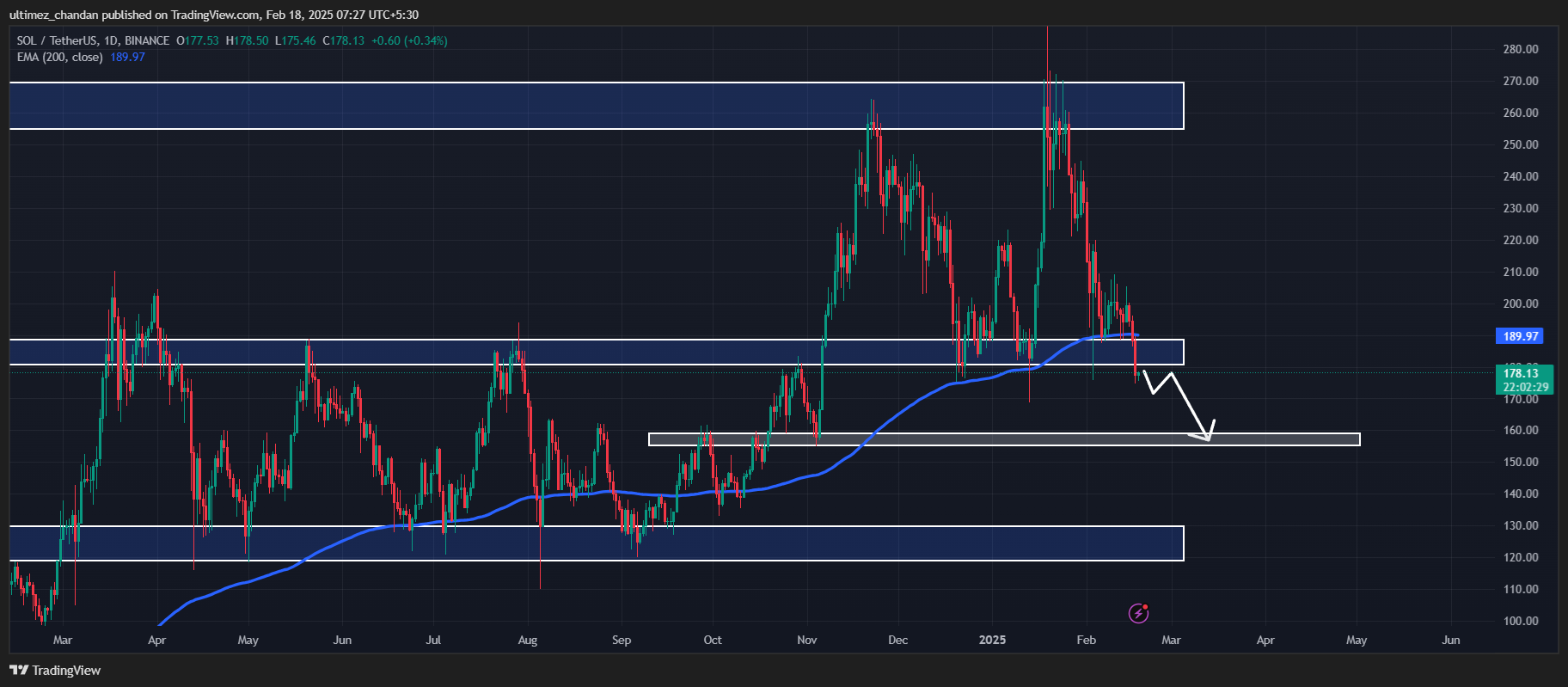 Solana (SOL) ha sido impactada por una caída general en el mercado de criptomonedas, cayendo por debajo de un nivel de soporte crítico. El nivel de $180 había servido como un soporte robusto desde noviembre de 2024. Sin embargo, la ruptura de este nivel podría indicar perspectivas negativas para SOL. Los movimientos recientes de precios sugieren un potencial de depreciación adicional de este altcoin.