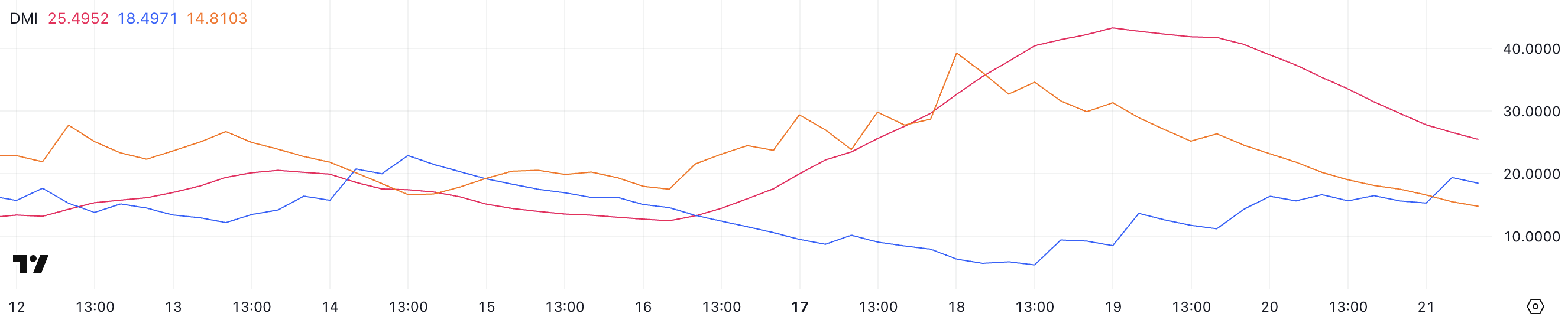 El gráfico del Directional Movement Index (DMI) de Solana muestra que su Average Directional Index (ADX) está actualmente en 25.4, bajando desde 43 hace solo dos días cuando el precio de SOL cayó a alrededor de 165 dólares.