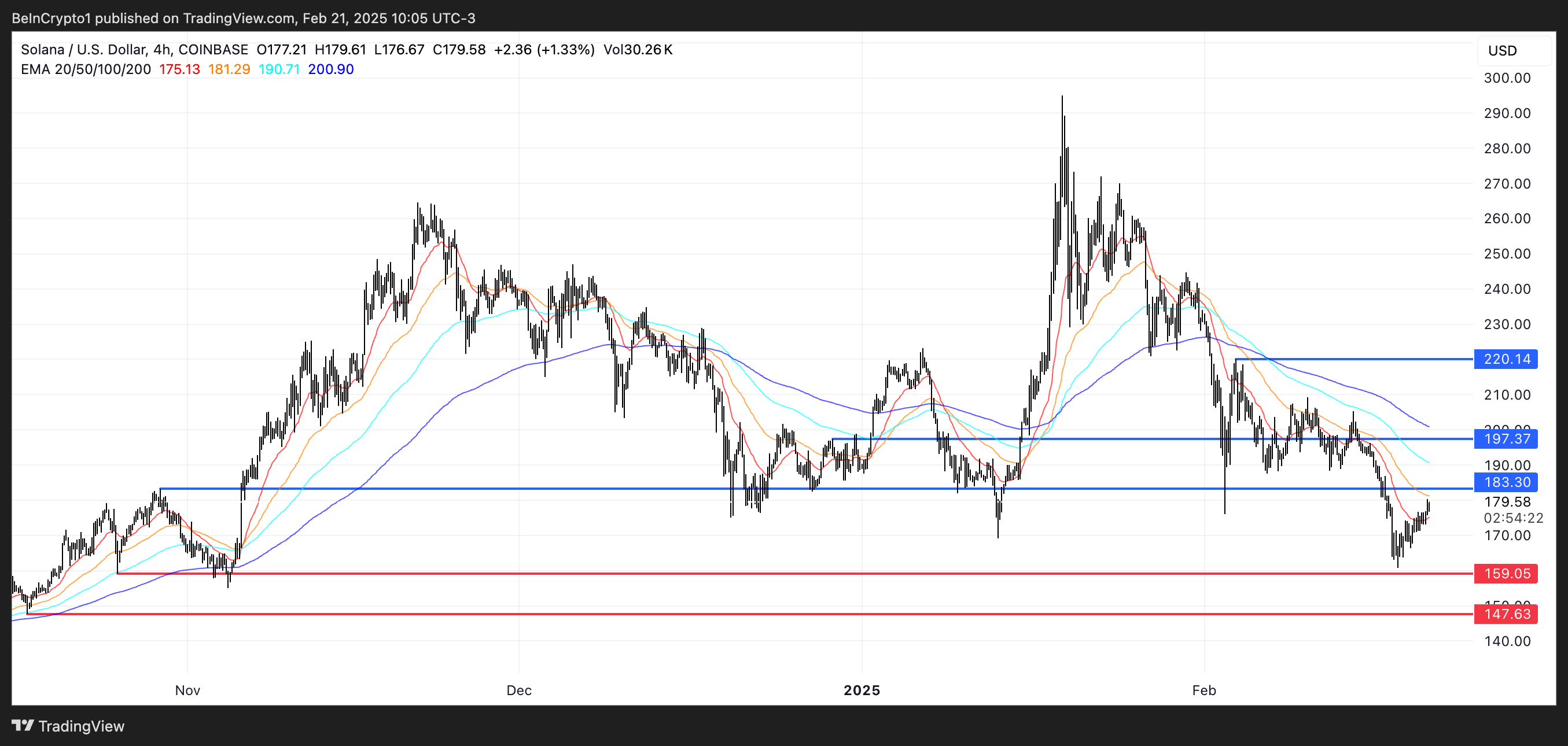 Las líneas de la Media Móvil Exponencial (EMA) de Solana aún indican una tendencia bajista, ya que las EMA a corto plazo están por debajo de las de largo plazo. Sin embargo, la dirección de estas líneas ha comenzado a cambiar ligeramente desde ayer, con el precio de Solana subiendo un 4%.