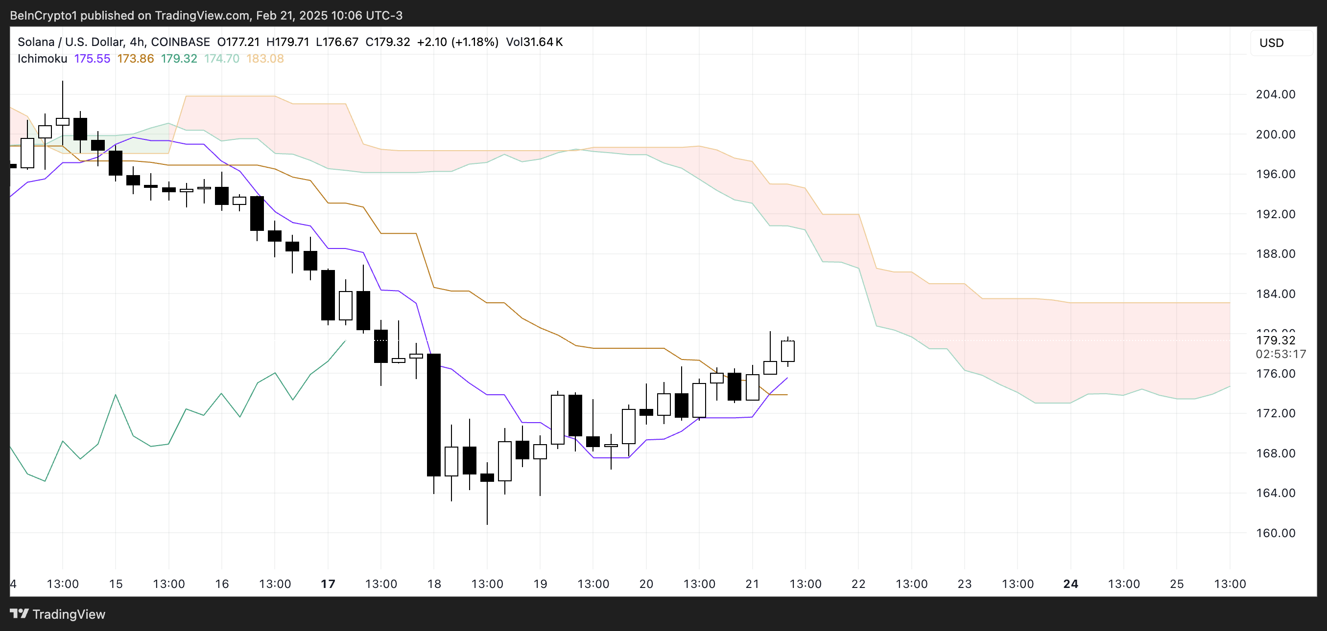 El gráfico de la Nube de Ichimoku de Solana muestra que el precio está actualmente por debajo de la nube roja, indicando que la tendencia bajista sigue siendo dominante.