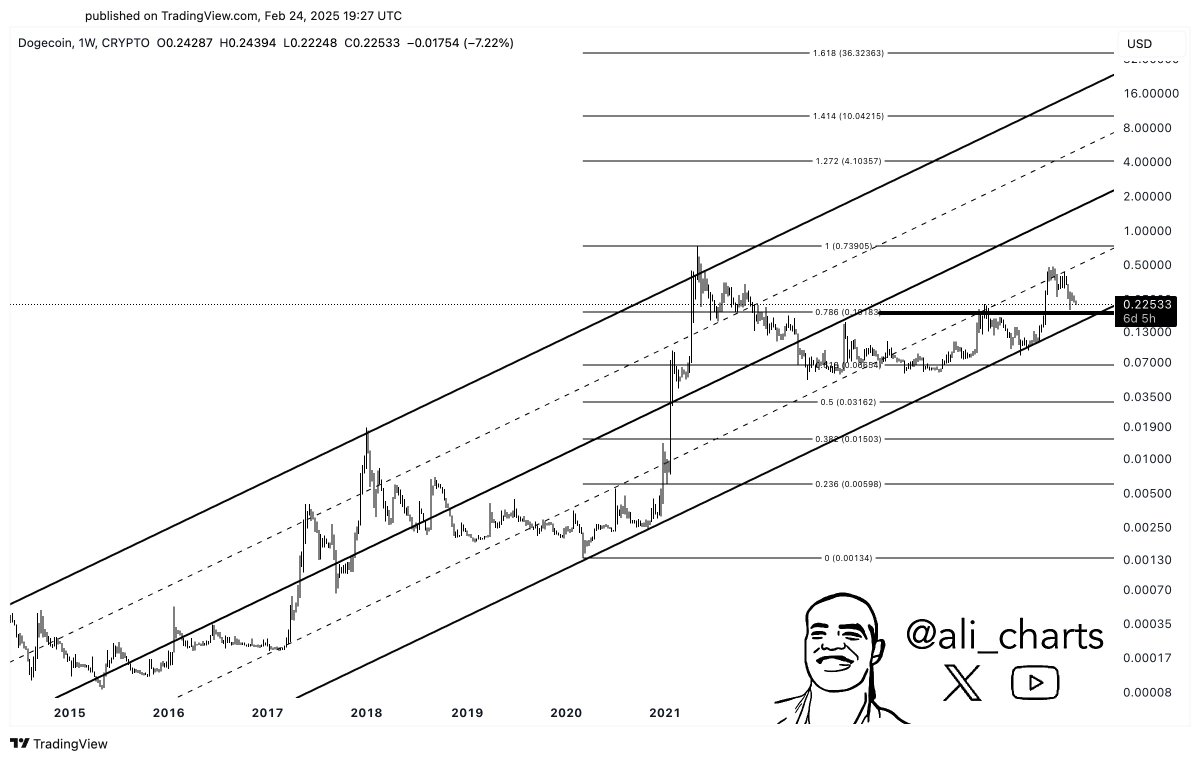 ¿Dónde estará el fondo para Dogecoin? Ali Charts sugiere que cerrar por debajo de $0.19 podría empujar los precios hacia abajo hasta $0.06. Al momento de escribir, el precio de DOGE está al borde.