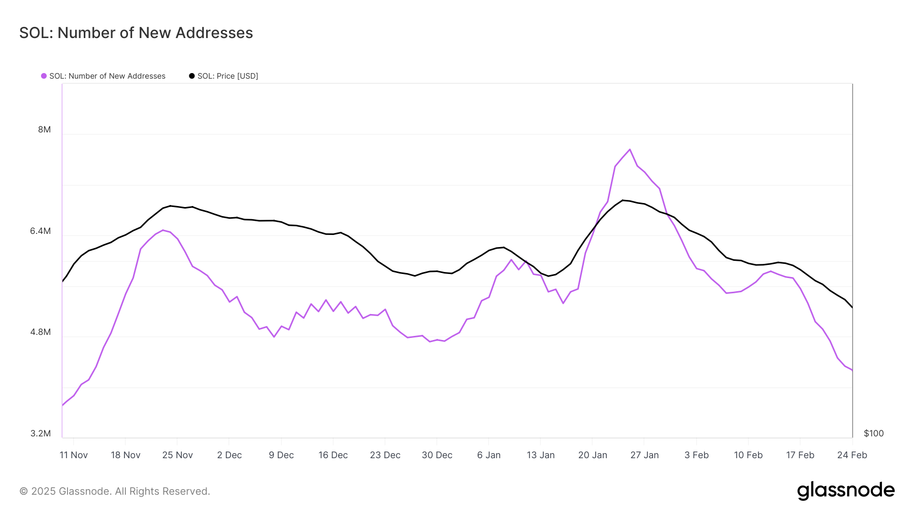 El impulso macro más amplio de Solana también muestra signos de debilitamiento. Las nuevas direcciones en la red han caído a un mínimo de tres meses, señalando una falta de nueva inversión en SOL.