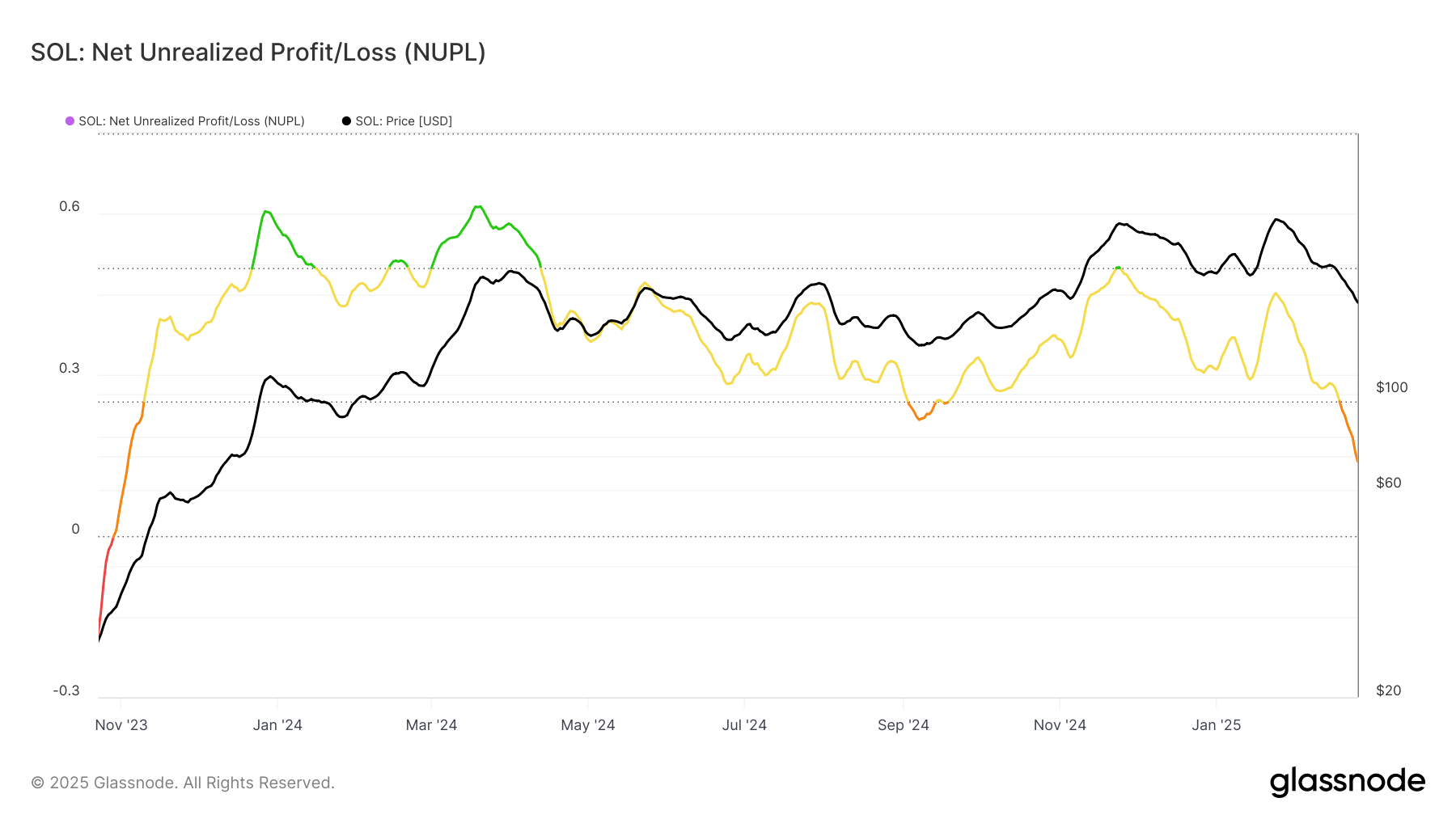 El sentimiento actual en el mercado de Solana es abrumadoramente bajista, como lo indica la métrica NUPL (Net Unrealized Profit and Loss).