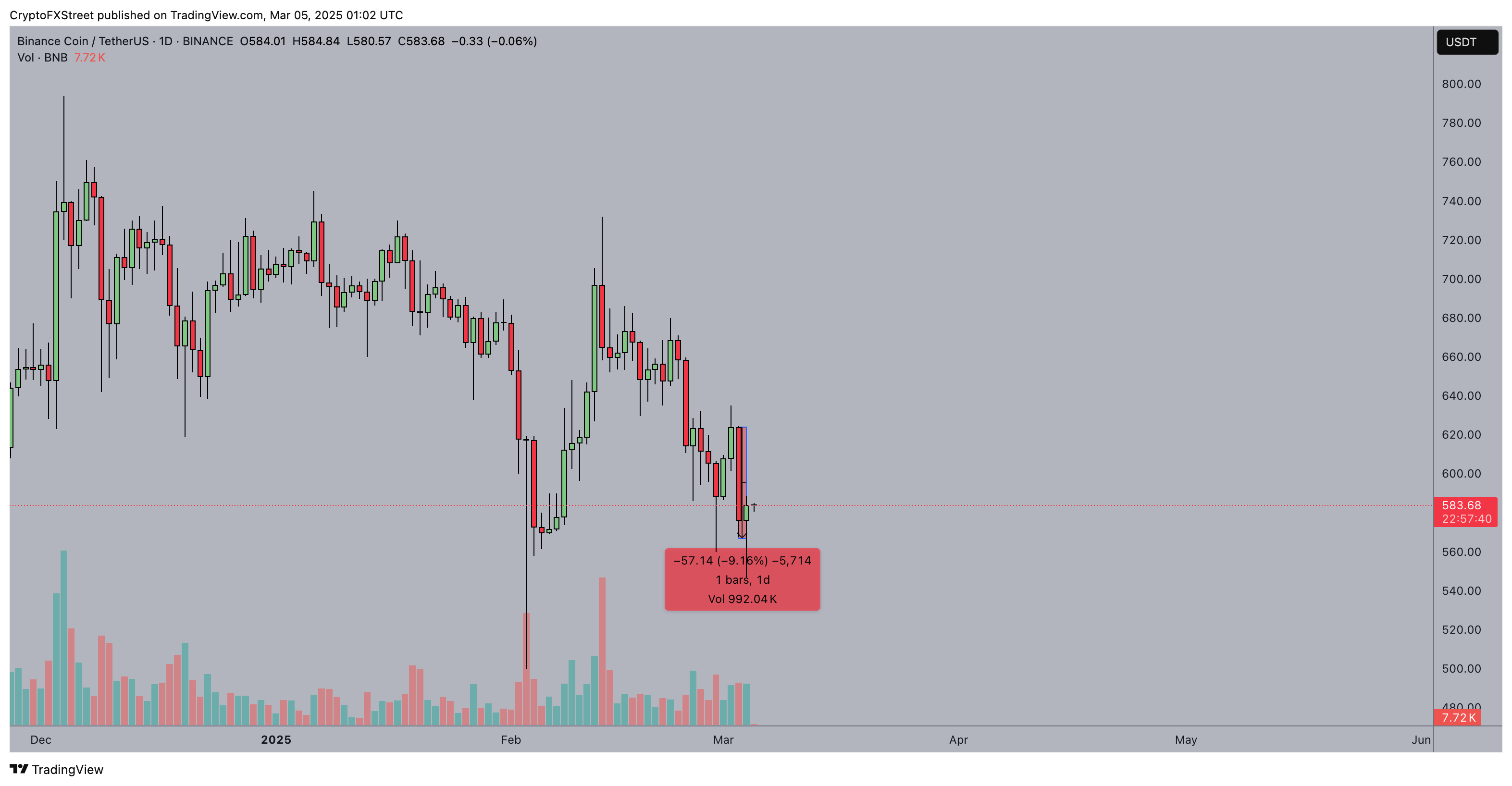 El precio de Binance Coin (BNB) se estabilizó en 560$ el martes, con su caída del 9% representando las menores pérdidas entre los cinco principales criptoactivos. Los volúmenes de negociación en aumento parecen estar amortiguando el impacto del sentimiento negativo del mercado tras la decisión de Trump de excluir a BNB de la recién establecida reserva estratégica de criptoactivos.