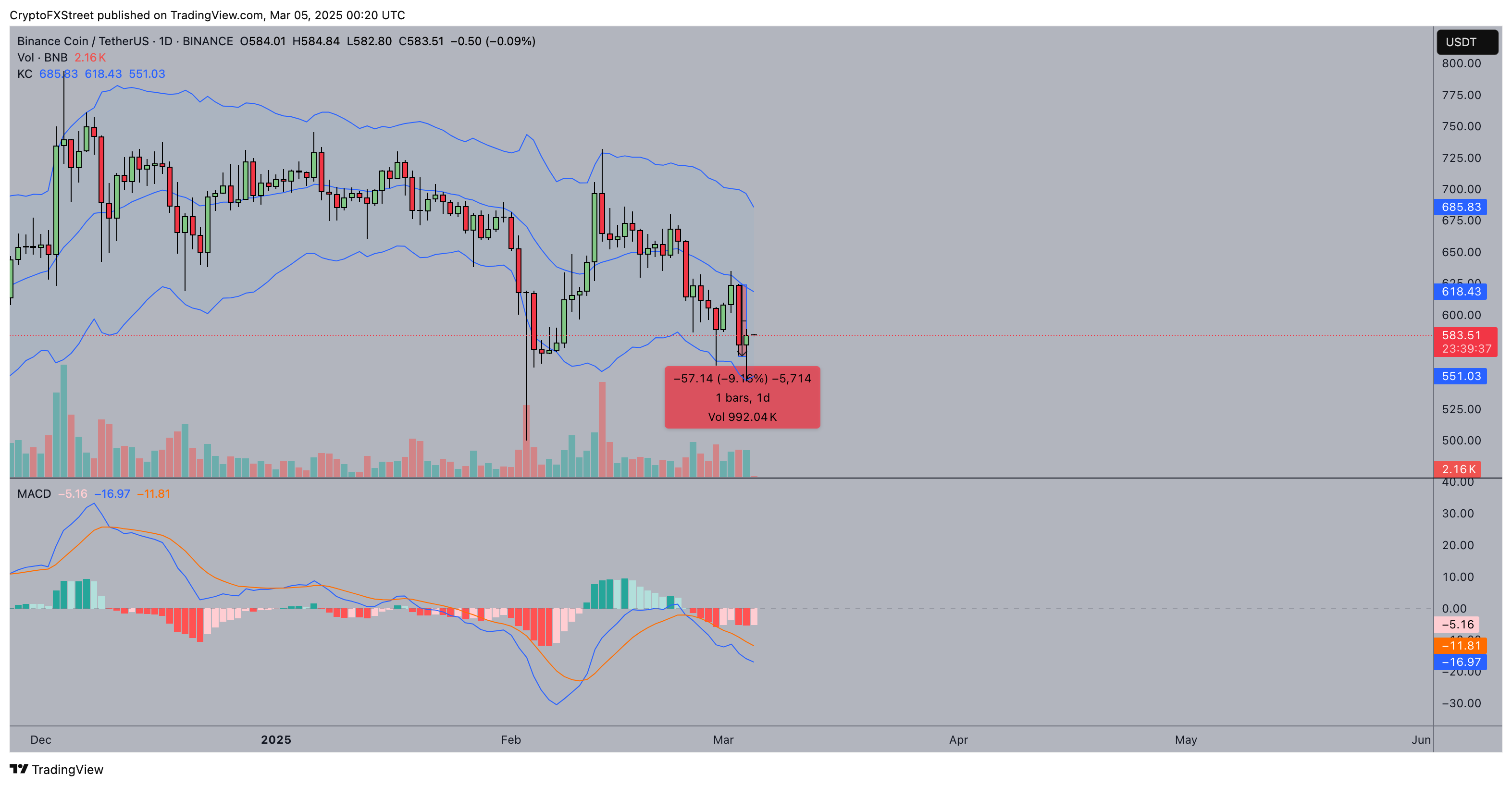 El precio de BNB se cotiza a 584.19$, recuperándose de un mínimo reciente cerca de 550$, un nivel de soporte crítico que se alinea con el límite inferior del Canal de Keltner.
