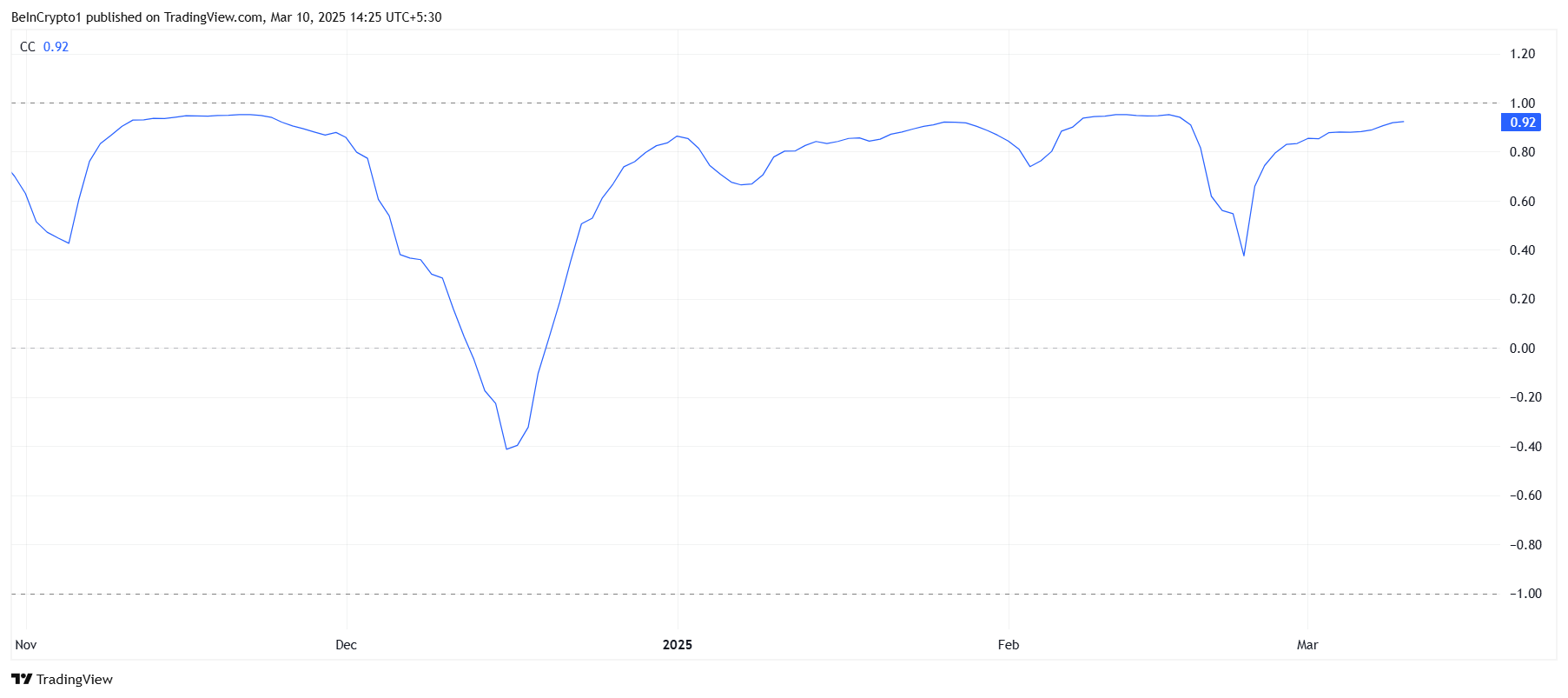 Solana mantiene una fuerte correlación con Bitcoin, actualmente en 0.92. Aunque una alta correlación generalmente señala una alineación alcista, en el caso de SOL, es un indicador bajista.