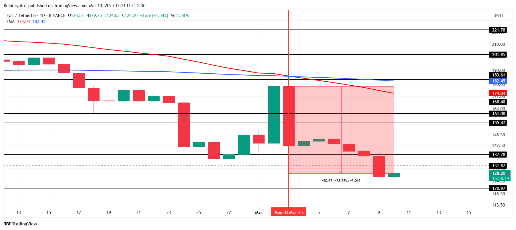 Actualmente, SOL se mantiene por encima de 120 dólares, intentando estabilizarse. Sin embargo, si las condiciones generales del mercado no mejoran, la altcoin corre el riesgo de romper por debajo de su soporte clave en 128 dólares.