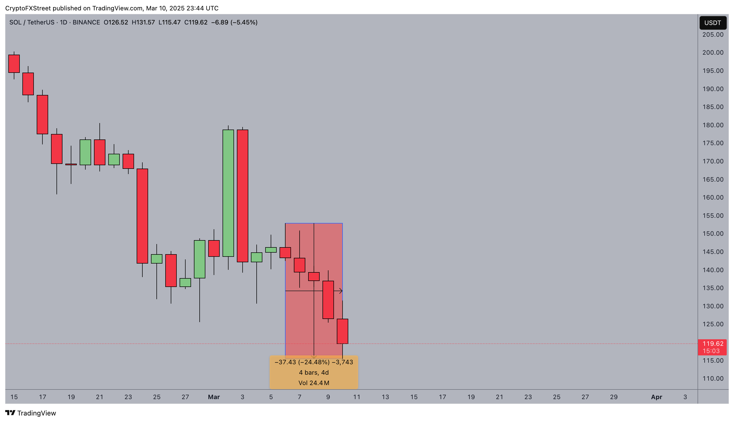 Como resultado, Solana ha estado en una racha de pérdidas constante desde el 5 de marzo, con precios cayendo un 24.5% en cinco días consecutivos. En el momento de la publicación, SOL se cotizaba alrededor de 115$.